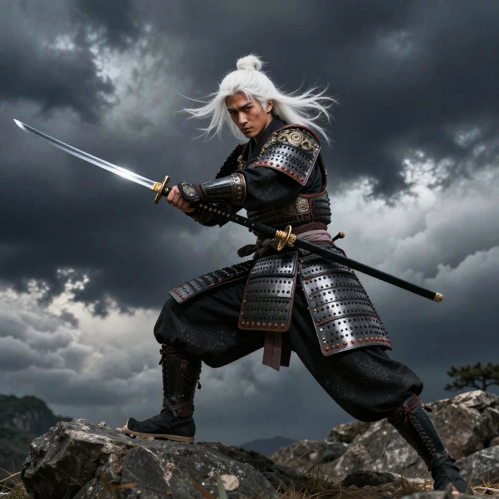 Epic portrait of a Russian samurai in ornate armor combining samurai design and Russian medieval motifs, holding a katana with engravings of Russian symbols, background of a cold northern landscape with aurora borealis in the sky, highly detailed and vibrant.