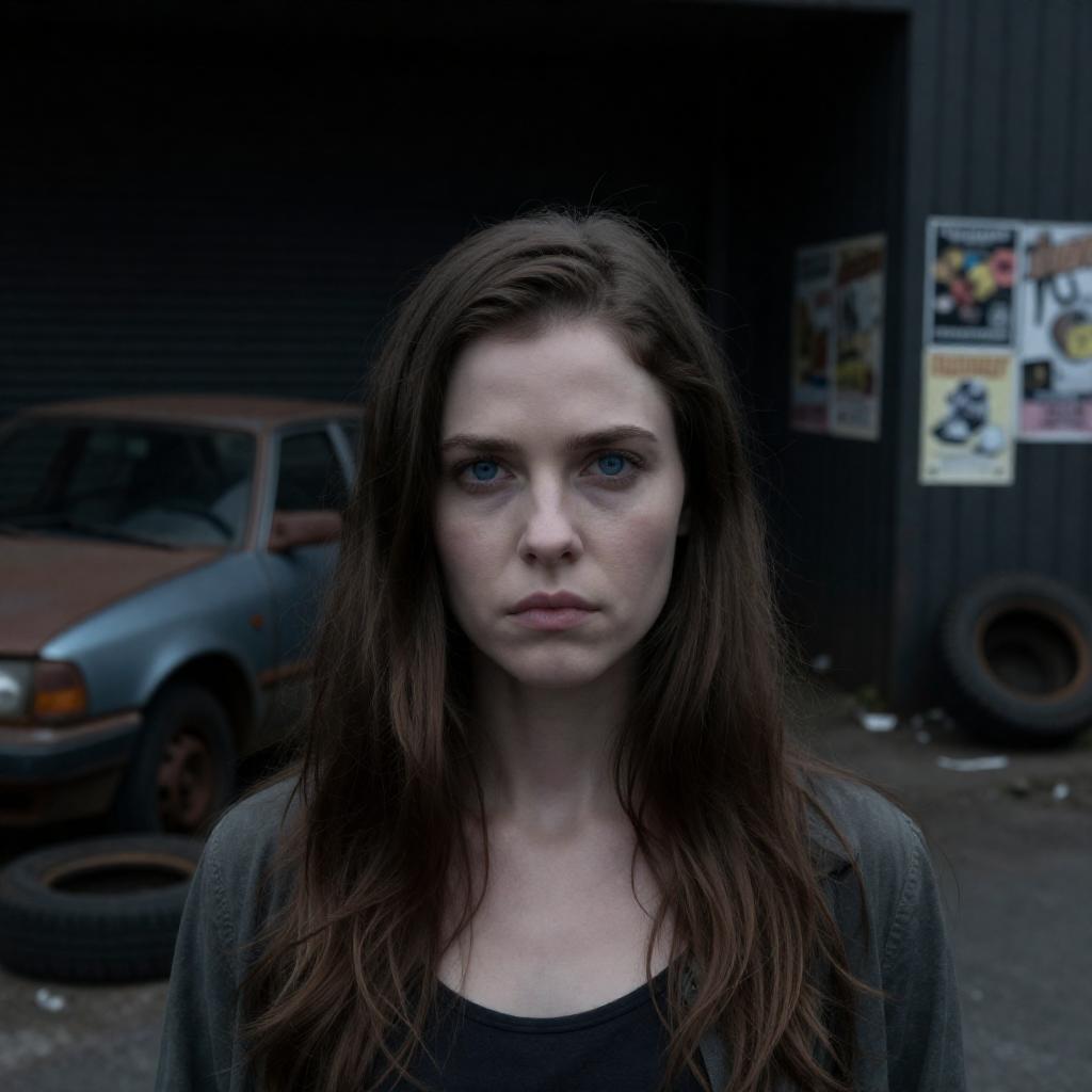 Young woman with fair skin and blue eyes, wearing a blue quilted cardigan over a patterned blouse, standing in a green field. Braided brown hair. Background: two red-roofed buildings, trees, cloudy sky. Serious expression. Photographic image.