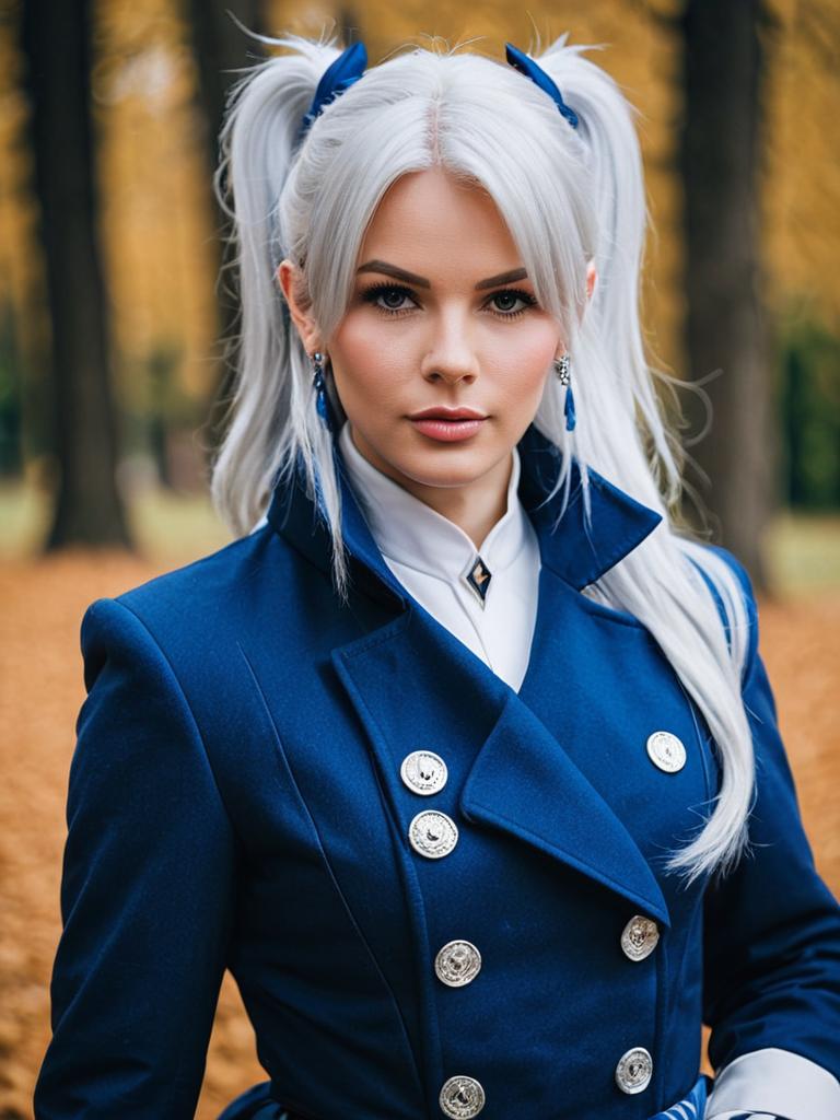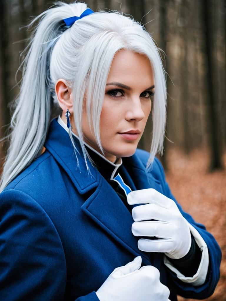 Photo-realistic cosplay photo of person in alphinaud leveilleur costume. 1boy, blue eyes, hair between eyes, hair over one eye, white hair, long hair, grey hair, ahoge, ponytail, hair ribbon, white gloves, blue coat, earrings, elezen, earcliplifestyle stock photo, shallow depth of field, lifestyle stock photography, shallow depth of field, natural lighting, warm tones, soft background blur, candid moments, vibrant colors, realistic textures, modern casual clothing. full body shot