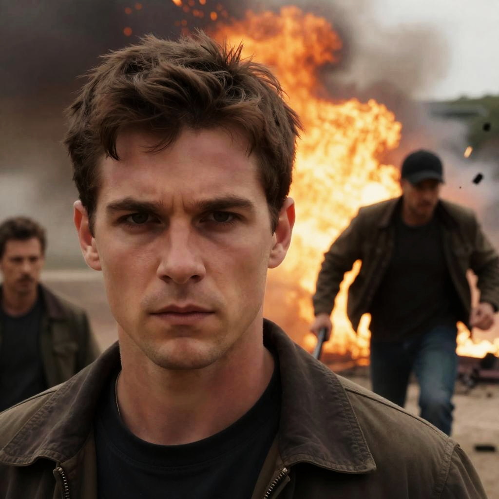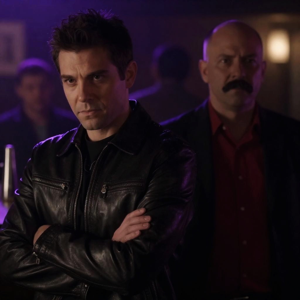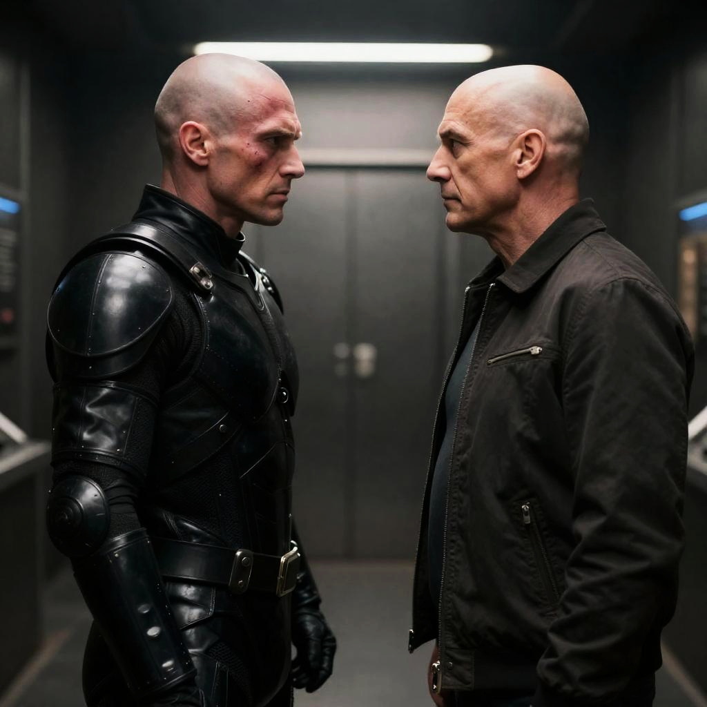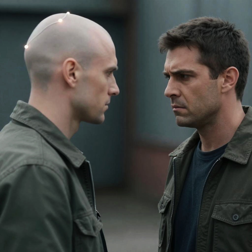 Photograph of a bald man with glowing white wires on his head facing a tense, angry man with short dark hair. Both wear green jackets. Background is blurred with industrial elements. Close-up, intense expressions, two people.
