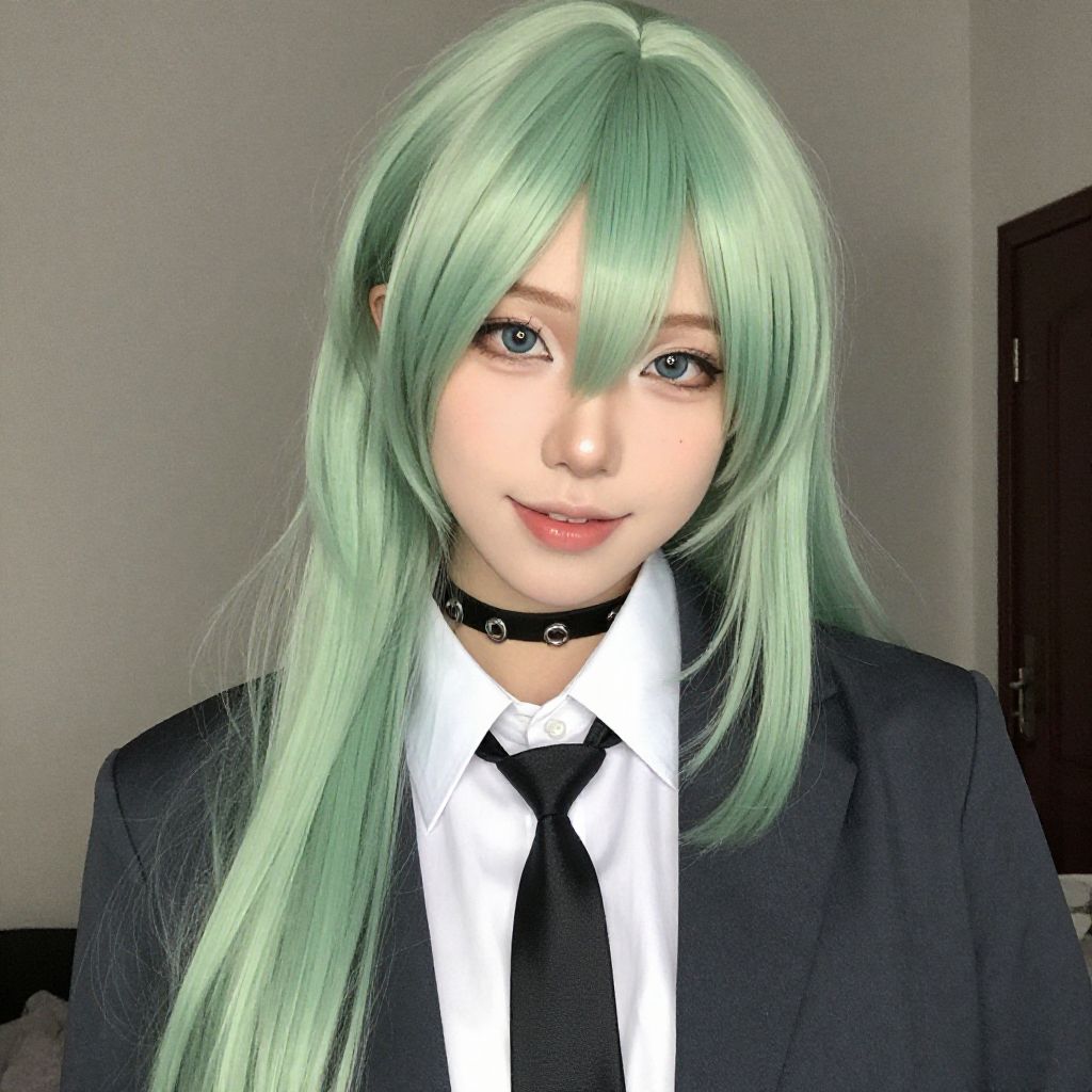 "light green cosplay wig, 1girl, solo, realistic, necktie, formal, suit, green hair, long hair, looking at viewer, lips, upper body, black necktie, shirt, jacket, smile Realistic photo of casual sexy person with pretty face"