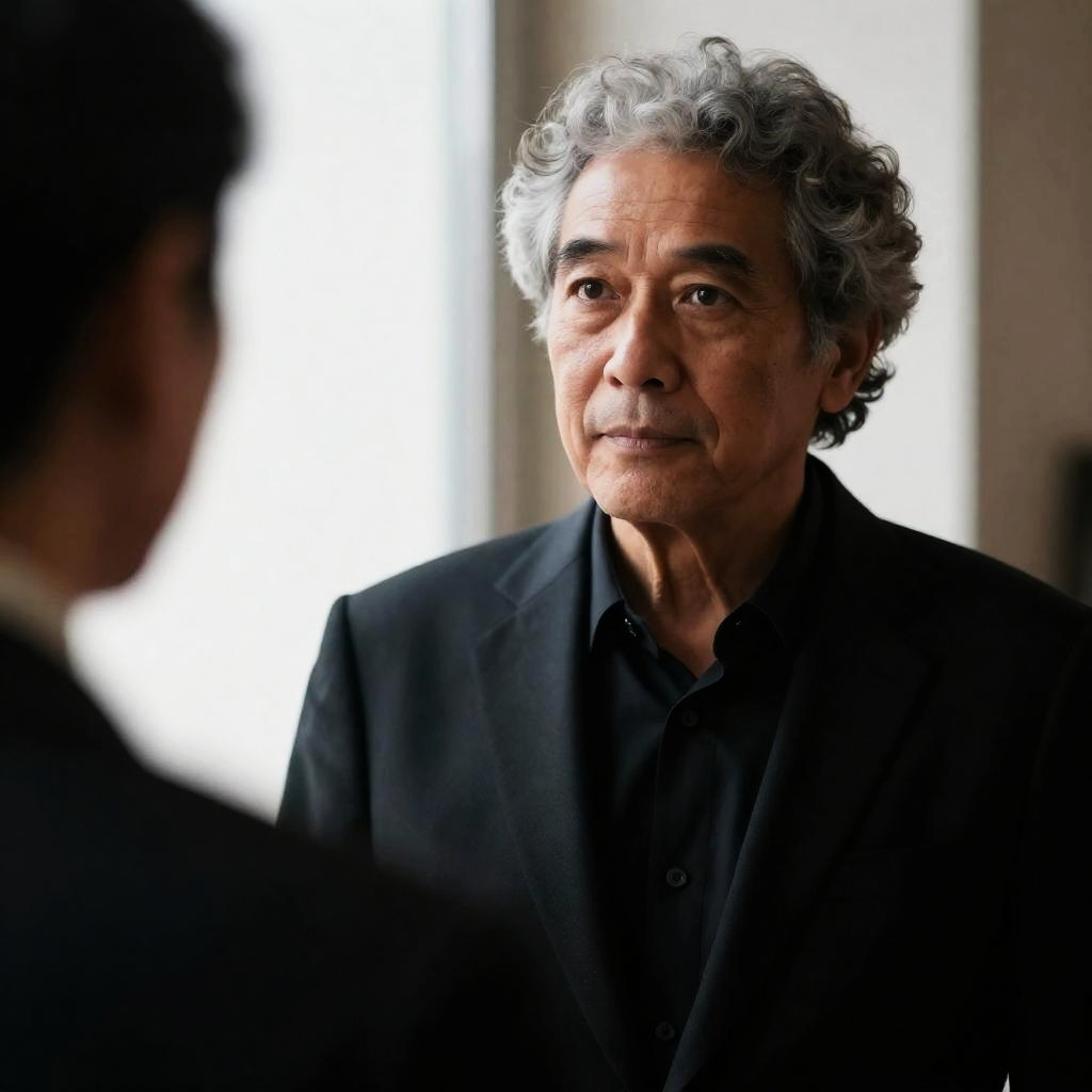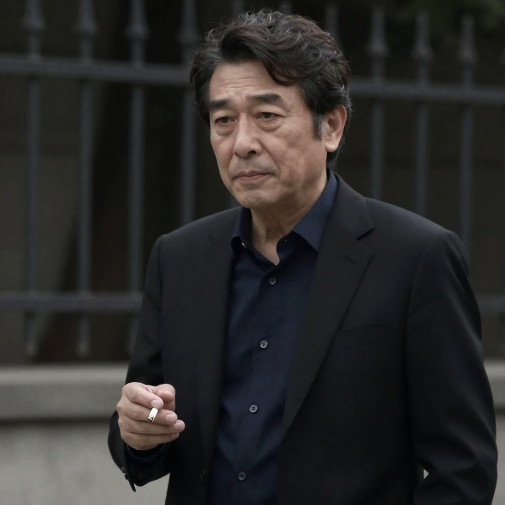 An elderly man with balding head, wearing a dark suit and tie, holds a cigarette in his right hand. He sits at a table, looking slightly to his left. Glasses and a glass are on the table. Dimly lit background.