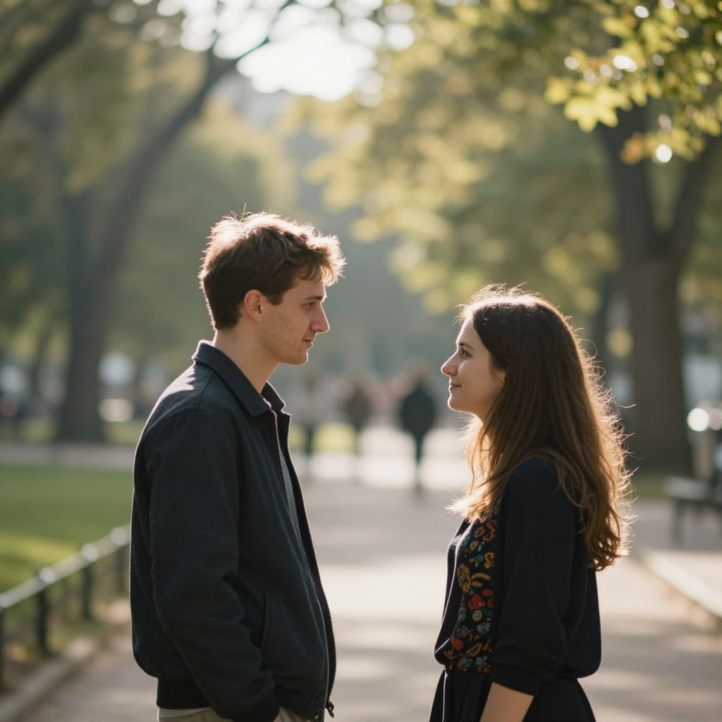 Photograph of a sunlit park scene with a blurry effect. A man and a woman stand facing each other, silhouetted against the bright background. The man, on the left, has short brown hair and wears a dark jacket. The woman, on the right, has long brown hair and wears a dark top with a colorful pattern. Trees with sunlight filtering through create a bokeh effect.