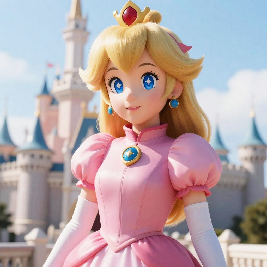 Absurdres, 1girl, medium breast, star eye, (princess peach), blush, (realistic:1.5), (blue eyes:0.8), (masterpiece, Extremely detailed CG unity 8k wallpaper, best quality, highres:1.2), (ultra_detailed, UHD:1.2), (pixiv:1.3), perfect illumination, distinct, (1girl:1.4), (bishoujo:1.2), looking at viewer, unreal engine, sidelighting, perfect face, detailed face, bangs, perfect body, beautiful eyes, pretty face, (bright skin:1.4), idol, ulzzang-6500-v1.1, castle