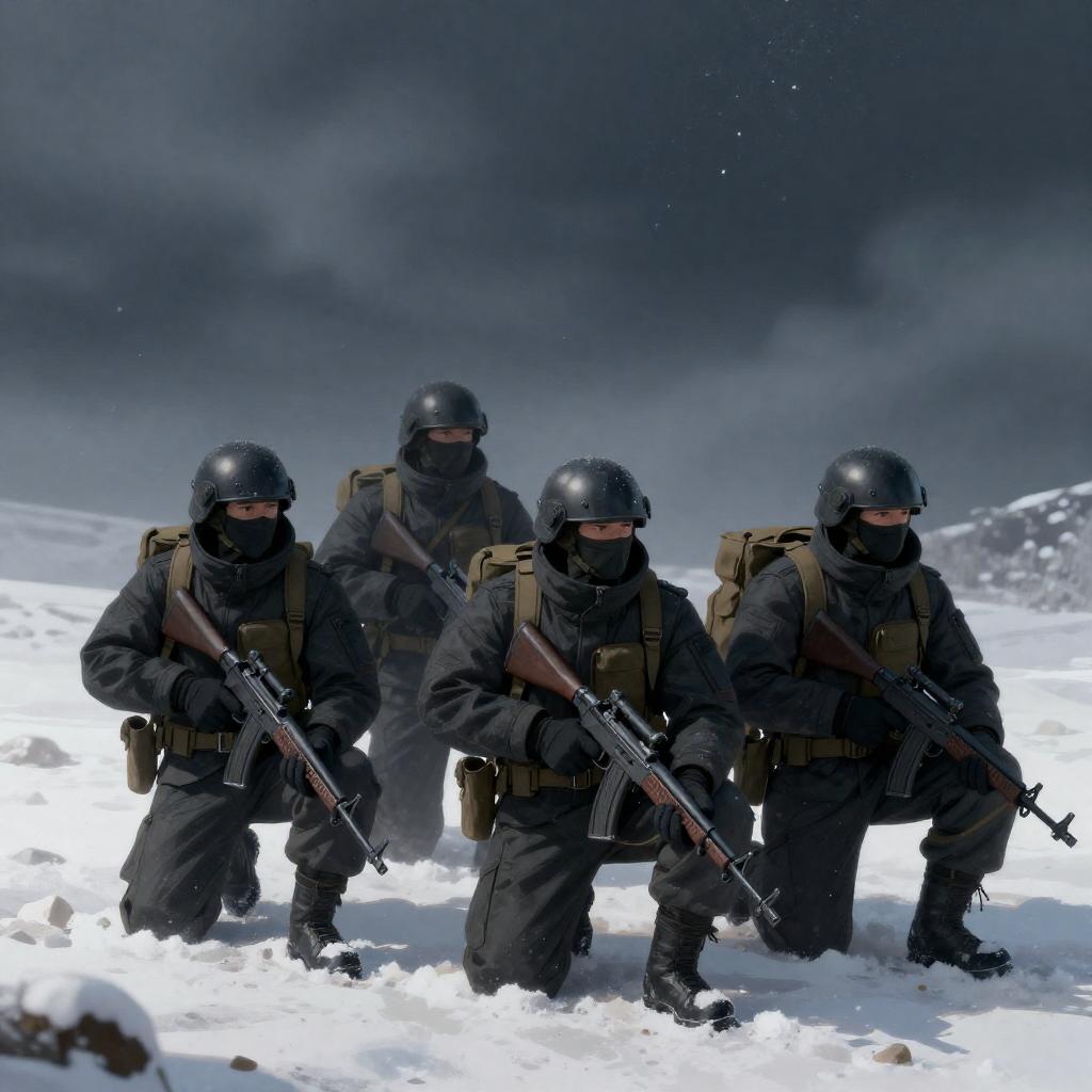 Digital illustration of four soldiers in dark, bulky winter gear with backpacks and rifles, crouching in a snowy landscape under a starry, cloudy night sky. Snowflakes fall around them, and they are positioned in a semi-circle, facing forward.