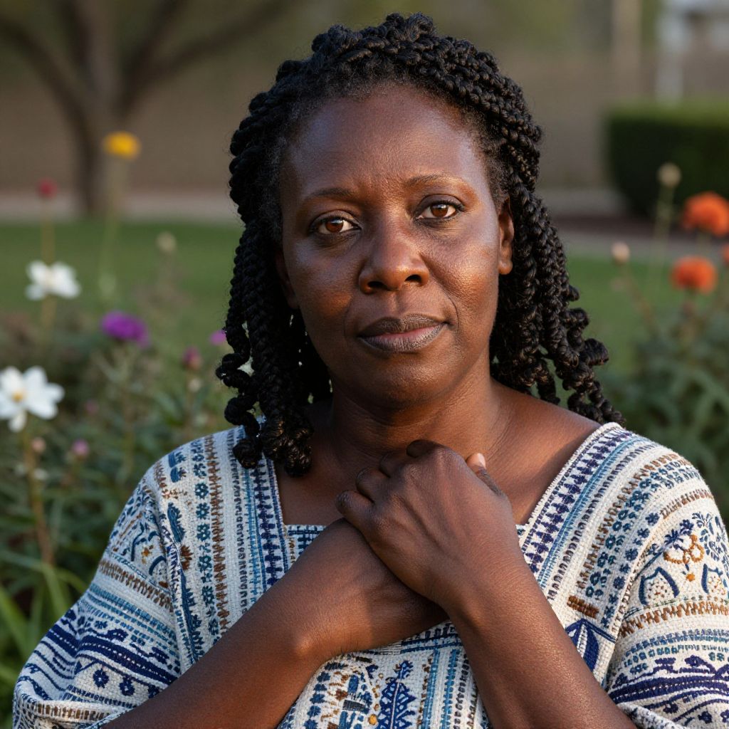 Craft a photorealistic portrait of an African American woman, aged 45, with warm brown eyes and dark curly hair elegantly braided. Capture her sitting in a serene garden setting, the blooming flowers mirroring the richness of her skin tone. Focus on an intimate close-up, detailing the texture of her handwoven cotton dress and the veins in her hands—testaments to resilience and strength. Soft morning light casts gentle shadows across her face, emphasizing fine lines that speak of laughter and tears alike. Her expression radiates wisdom and compassion, inviting viewers into a profound emotional connection with this captivating individual.