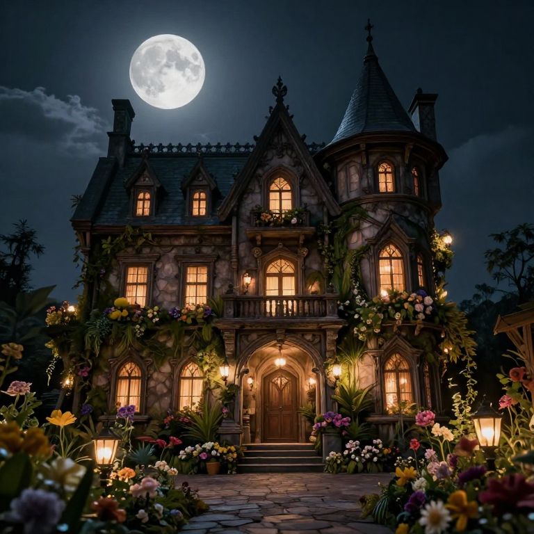 A dark fantasy gothic mansion adorned with flowers and plants, illuminated by a full moon and numerous lights, evoking a Harry Potter-style atmosphere.