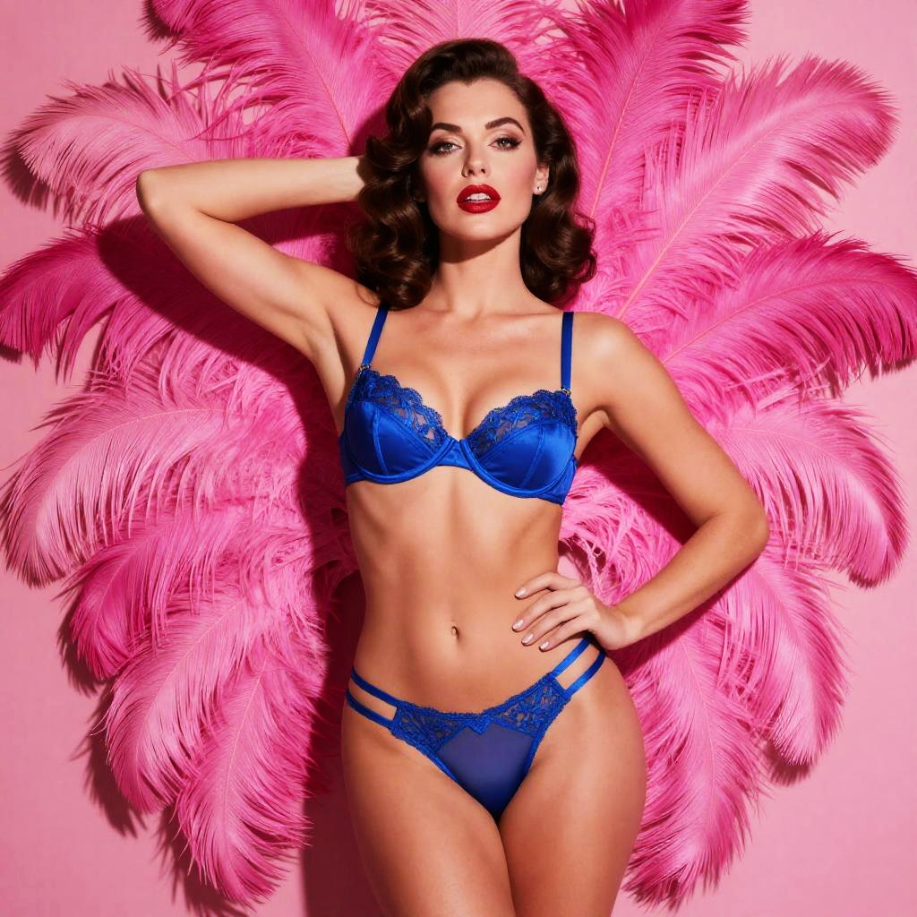 This captivating image showcases a glamorous woman in a striking blue lingerie set, contrasting beautifully with a vibrant pink feather backdrop. The bold colors and elegant pose evoke a glamorous vintage style, reminiscent of classic burlesque performances.