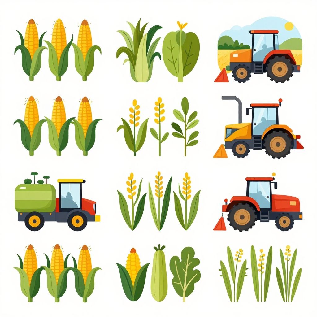 Colorful digital illustration of corn plants, tractors, and agricultural tools in a 3x4 grid layout on a white background.