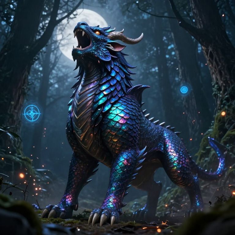 Legendario mythical beast roaring fiercely in a dark enchanted forest, scales shimmering with iridescent colors under moonlight, surrounded by glowing magical symbols and floating embers, hyper-detailed fantasy artwork with dynamic composition.