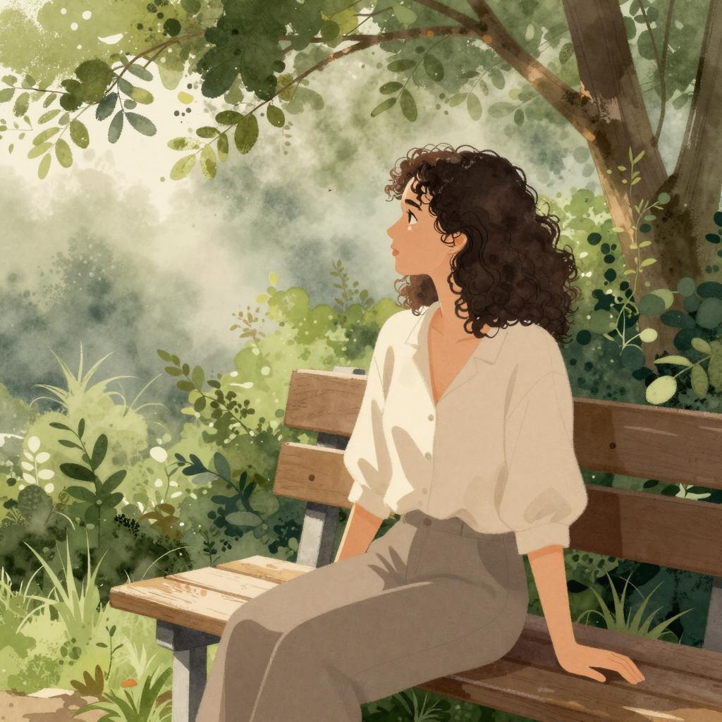 Illustration of a young girl with long brown hair standing on a forest path surrounded by large twisted tree roots and dense foliage. She wears a beige sweater, a white patterned scarf, blue jeans, and brown shoes. Sunlight filters through the trees, casting a warm, misty glow over the leafy forest floor.