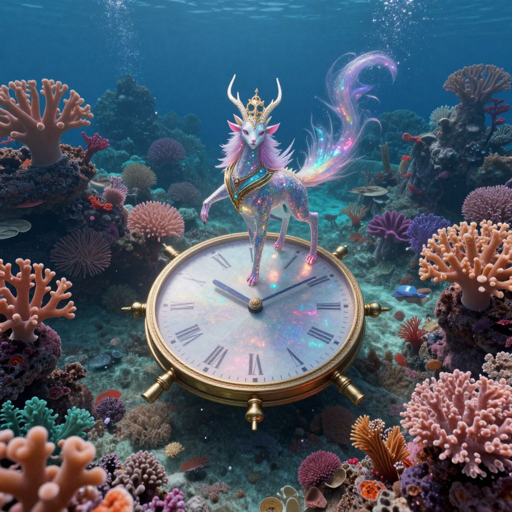 A mesmerizing digital artwork, reminiscent of surrealism, depicts an enchanting scene where a regal mythical creature stands atop an elegantly floating timepiece amidst a vibrant coral kingdom. The fantastical being emanates a spectrum of shimmering colors that blend seamlessly with the captivating hues of the underwater realm. From an aerial viewpoint, this dreamlike fusion of natural and otherworldly elements crafts an evocative ambiance of mystique and wonder, beckoning viewers to embark on a surreal voyage through time and beyond.
