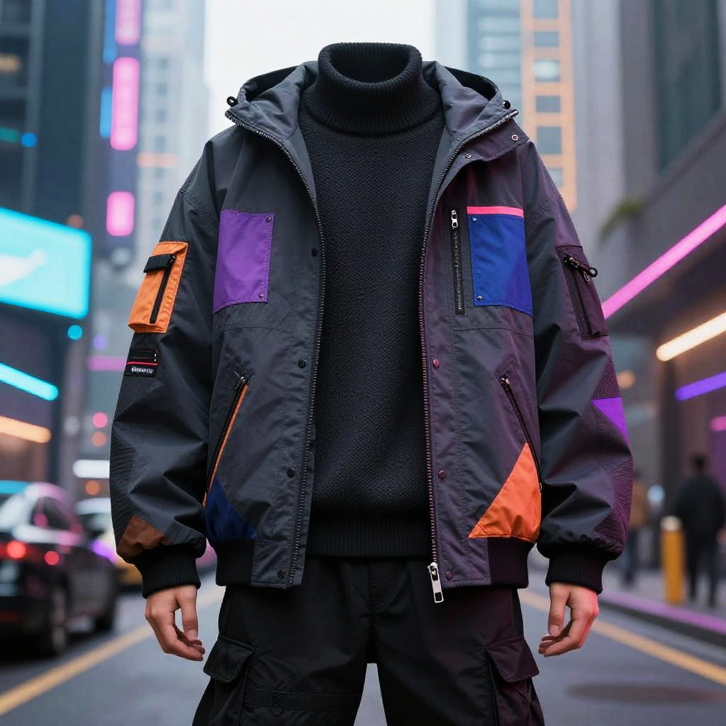 Midjourney fashion showcasing futuristic streetwear with bold geometric patterns, neon accents, and layered textures, set against an urban cyberpunk backdrop, vibrant colors blending technology and style seamlessly.