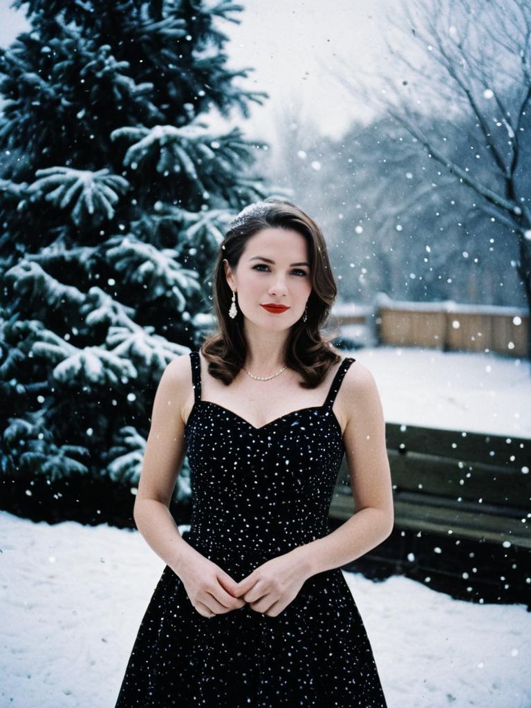 Woman in Christmas Party Dress, photorealistic outdoor portrait with snowy backdrop