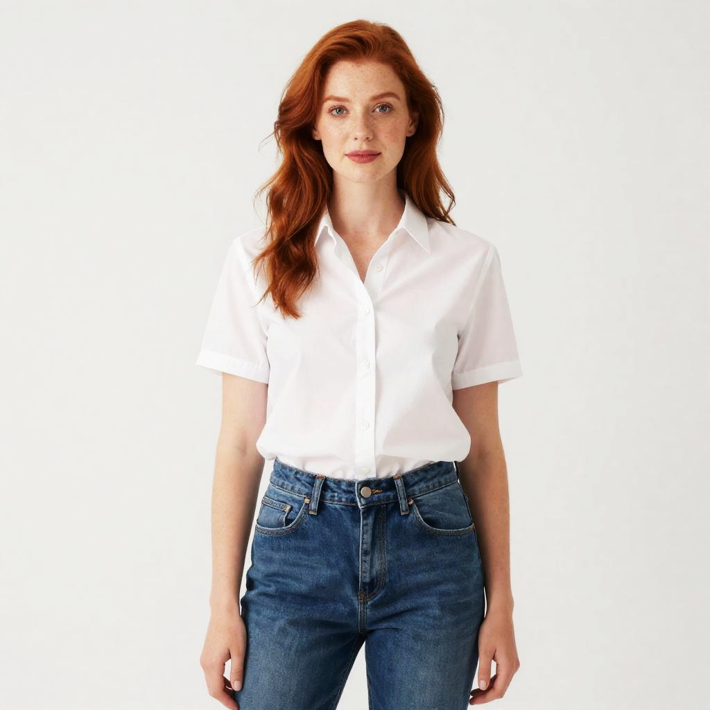 Nice Woman Work Clothes, woman with red hair and white shirt looking at camera