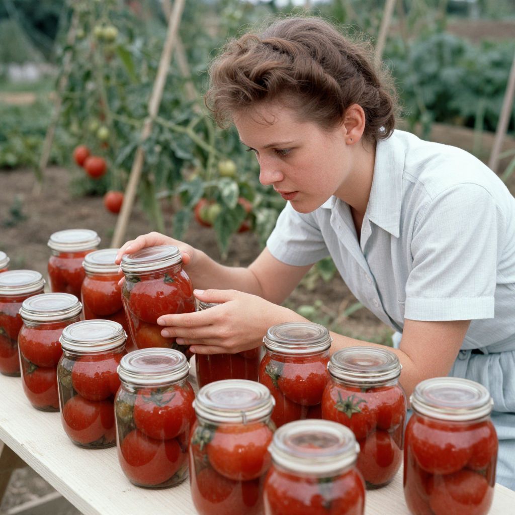 Woman inspecting rows of sealed glass jars filled with preserved tomatoes from her victory garden, captured by the U.S. Department of Agriculture in 1944.