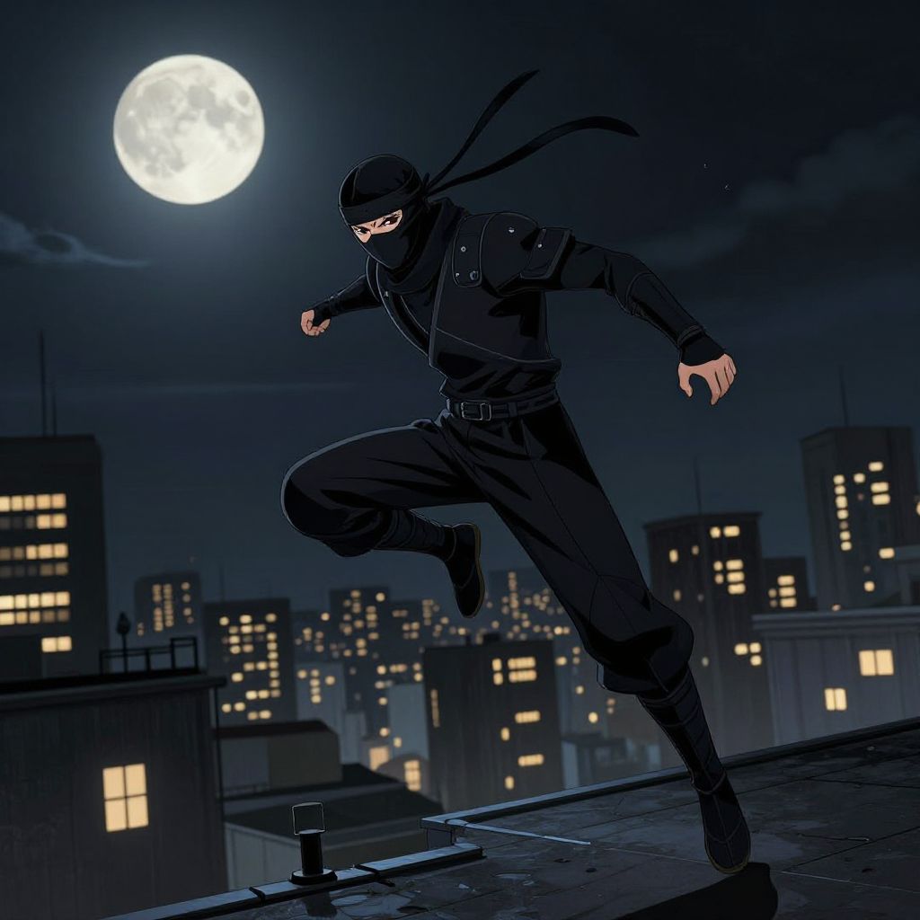 Digital art of a ninja in black gear, mask, and gloves, leaping on a rooftop under a bright full moon, with illuminated city buildings in
