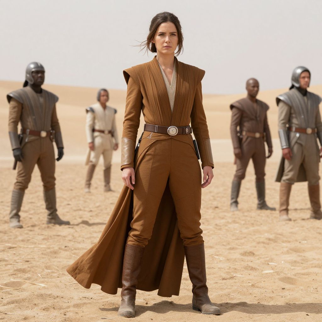 Rise Skywalker Rey Costume, a woman in a brown outfit standing in a desert with other people