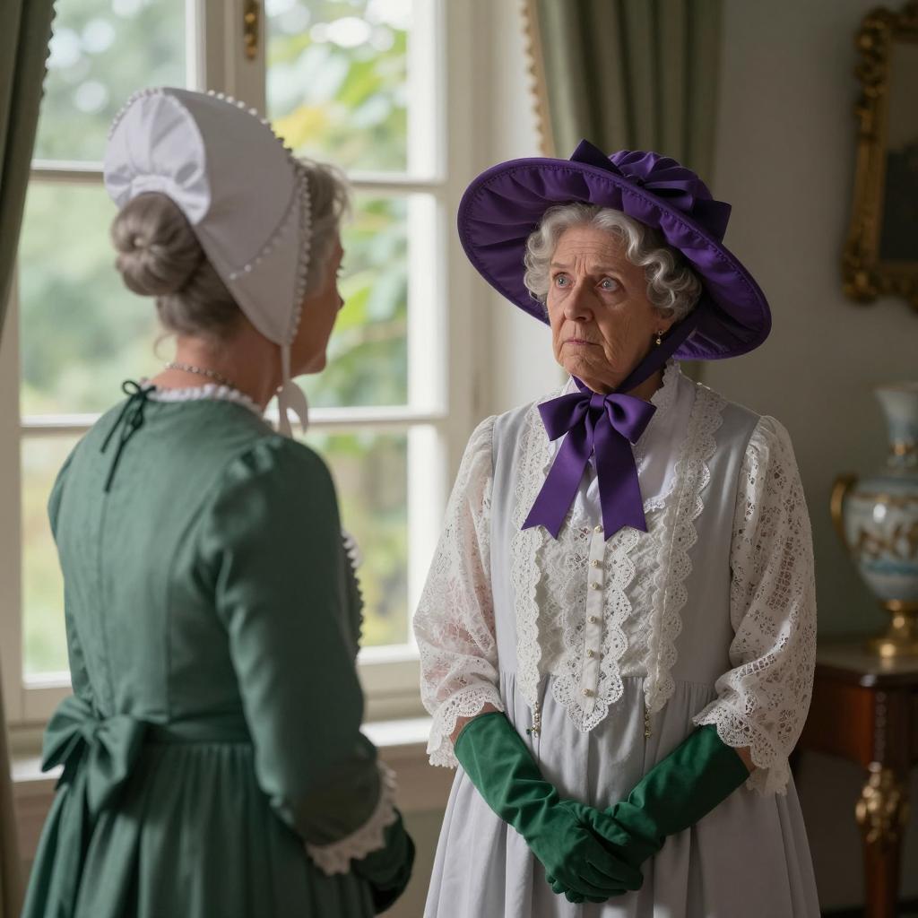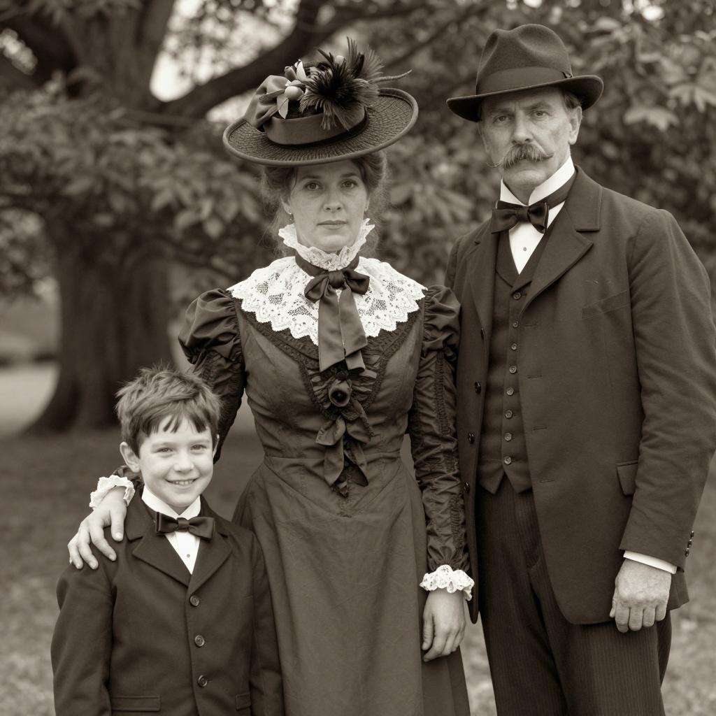 Victorian-era photograph. Four people in ornate dresses and suits. Two women in red and pink dresses, one with blonde hair, one with brown hair, sitting on a green couch, laughing. One man in black suit with white shirt and red bowtie, sitting on a chair, smiling. Older woman in black and red dress, holding a plate, standing behind a red tablecloth-covered table with candles. Wooden floor, patterned rug, candles on side table. Green curtains in background.