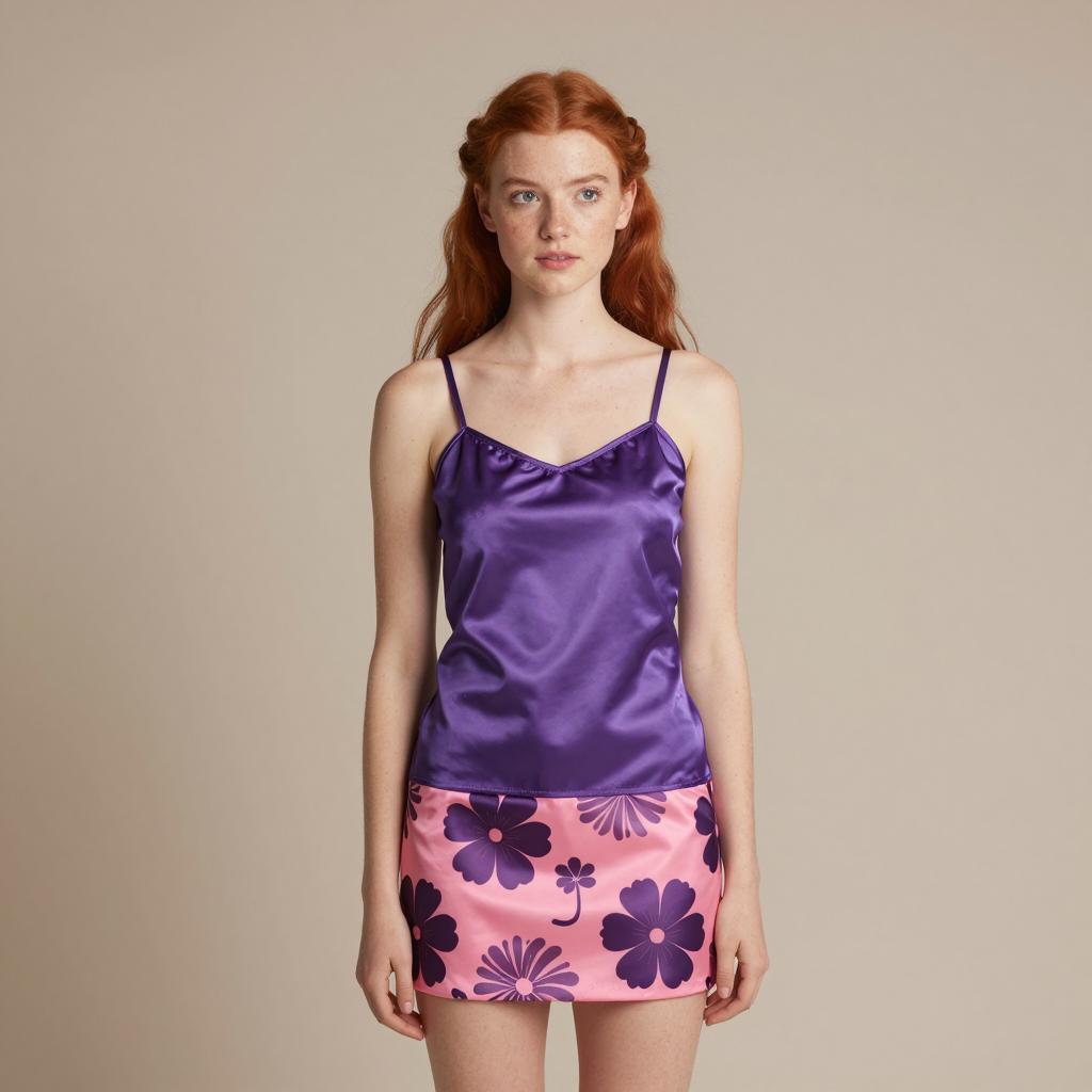 Boxer fancy dress girl, photograph of a young woman, red hair in pigtails, wearing a purple satin camisole and pink and purple floral patterned skirt, standing against a plain beige background, soft lighting, casual pose, straight-on view, realistic ure, no visible accessories, model looking slightly to the side