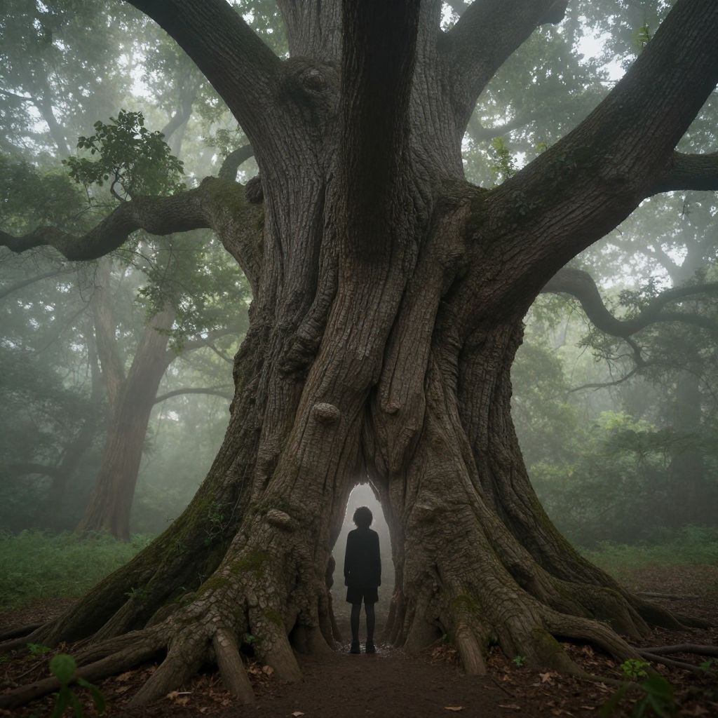 Photograph of a person standing in the shadow of a massive, gnarled tree with a natural archway, surrounded by misty forest.