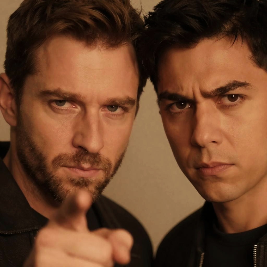 Photograph of two men with messy brown hair and rugged faces, wearing dark shirts. Foreground shows a close-up of a large erect penis, pointing towards the camera. Blue sky background. Both men have intense expressions, looking slightly down at the penis. Two men, one pointing, penis in foreground.