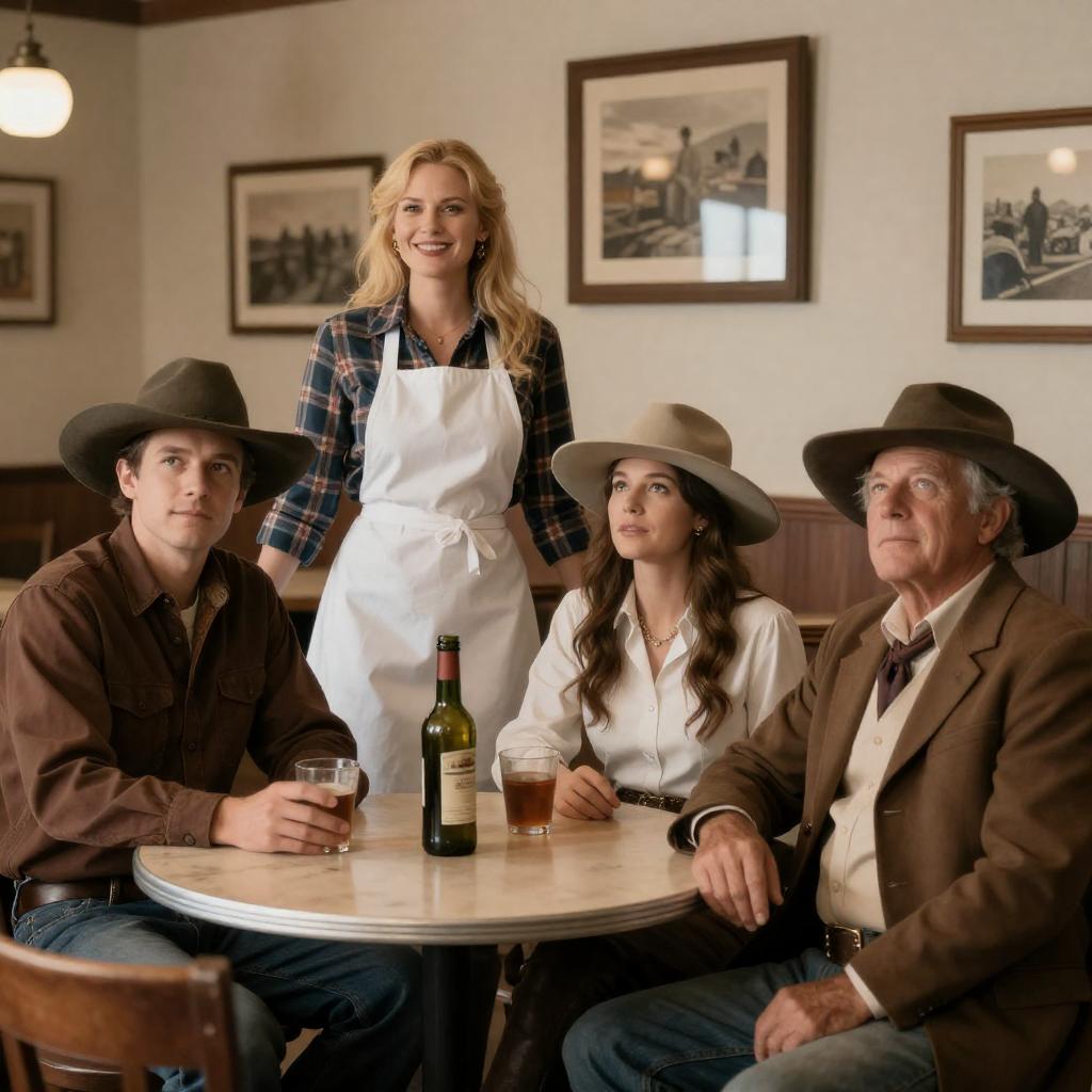 Photograph of four people in a Western-style saloon. Blonde woman in plaid shirt and white apron leans on table, smiling. Man in brown shirt and hat sits left, holding drink. Woman in white shirt and hat sits center, looking up. Older man in brown coat and hat sits right, looking up. Round table with glasses and bottles. Framed pictures on wall background.