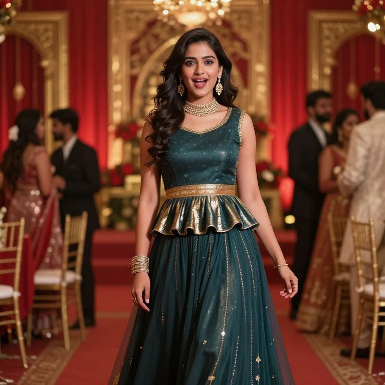A modern Indian girl dressed in a trendy party wear churidar dress with metallic gold trim and a subtle peplum, her face radiant with excitement, posing at a glamorous wedding reception with rich red and gold décor, surrounded by guests in formal attire.