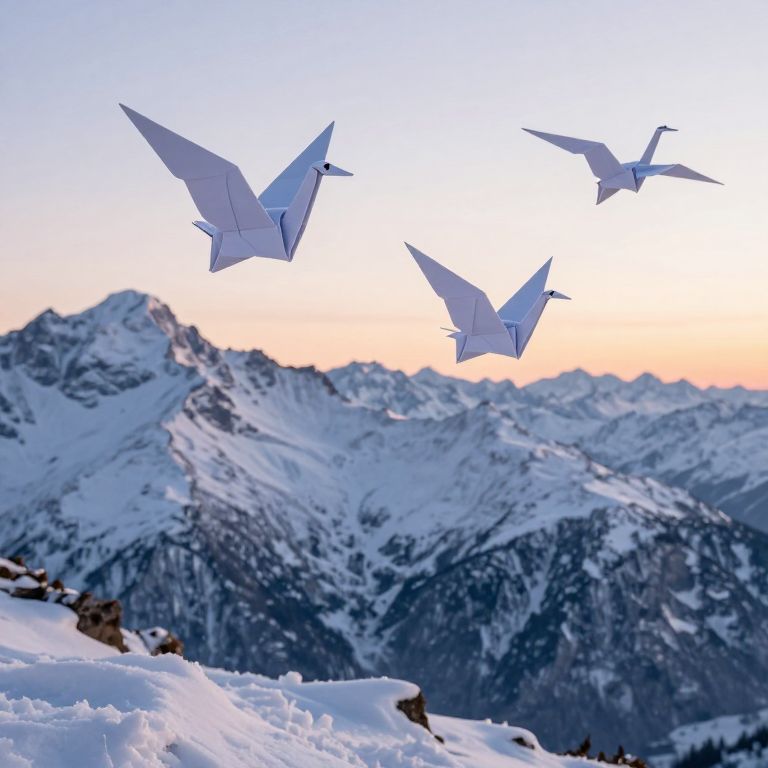 Origami cranes soar gracefully above a pristine, snow-covered mountain range, their translucent wings catching the soft light of a dreamlike dawn, as if the peaks themselves have come alive and taken flight.