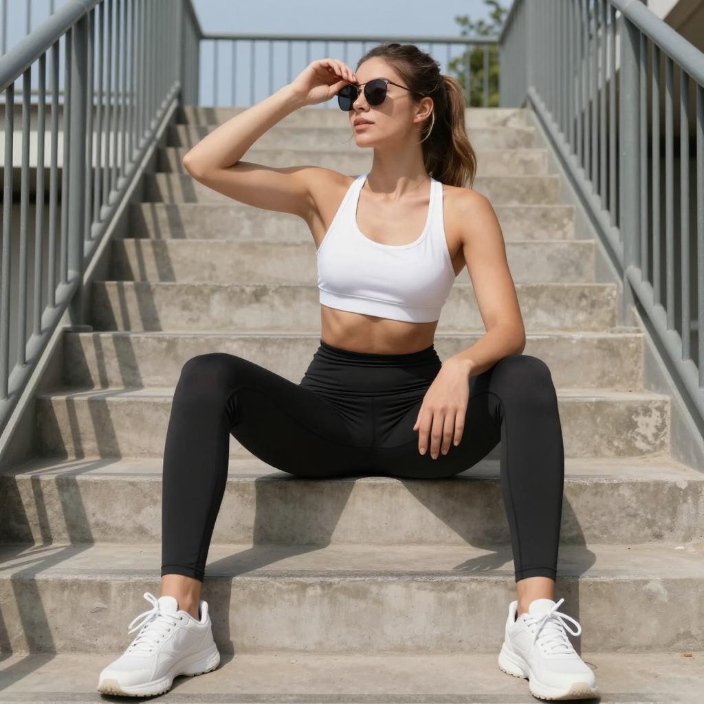 Photograph of two women standing next to a black helicopter door. Both women wear black athletic pants, white sneakers, and tank tops. The woman on the right has her hair in a bun and leans slightly forward, smiling. The woman on the left has long blonde hair, also smiling. A man in a blue shirt sits inside the helicopter. Clear blue sky and airport runway in the background. Helicopter's rotor blades above.