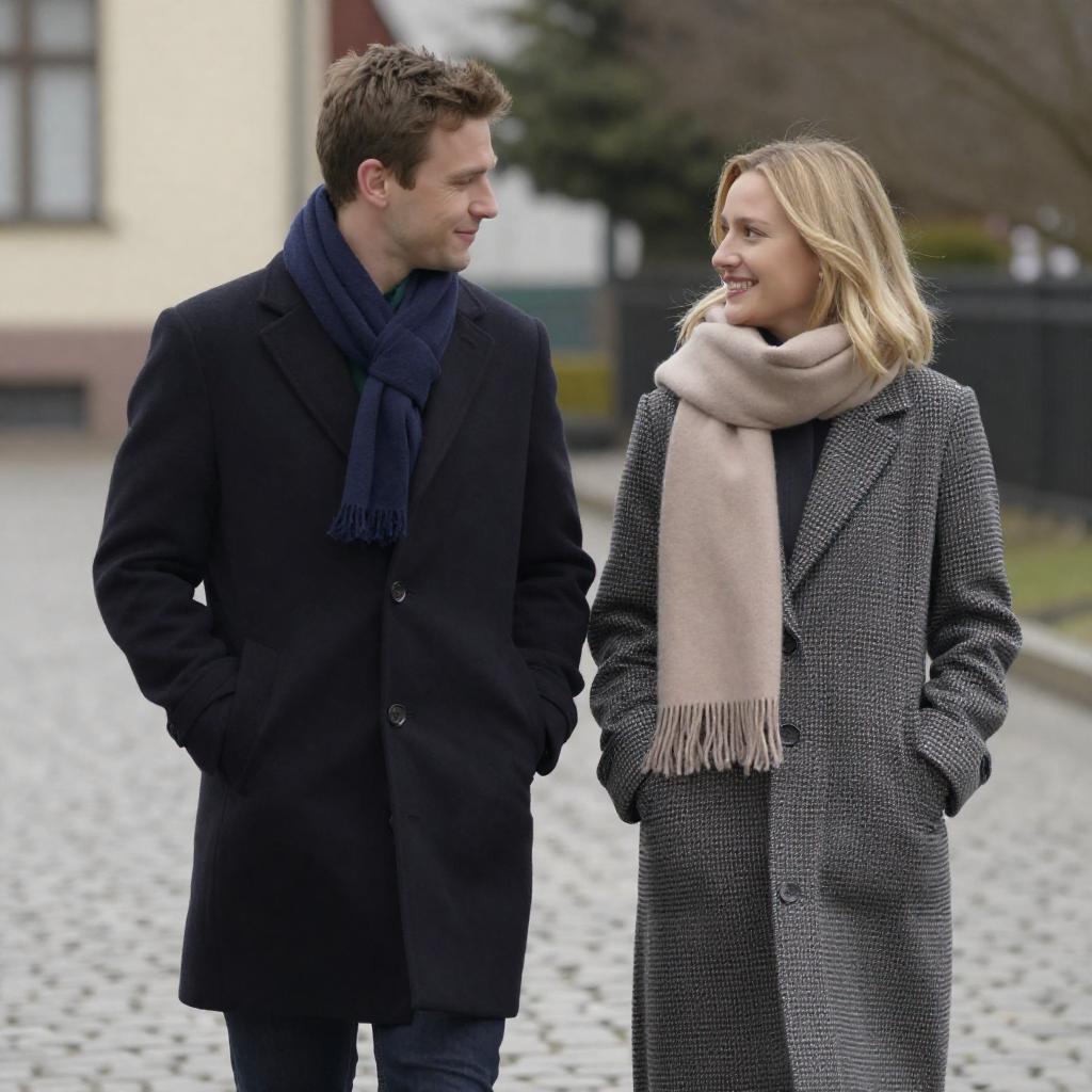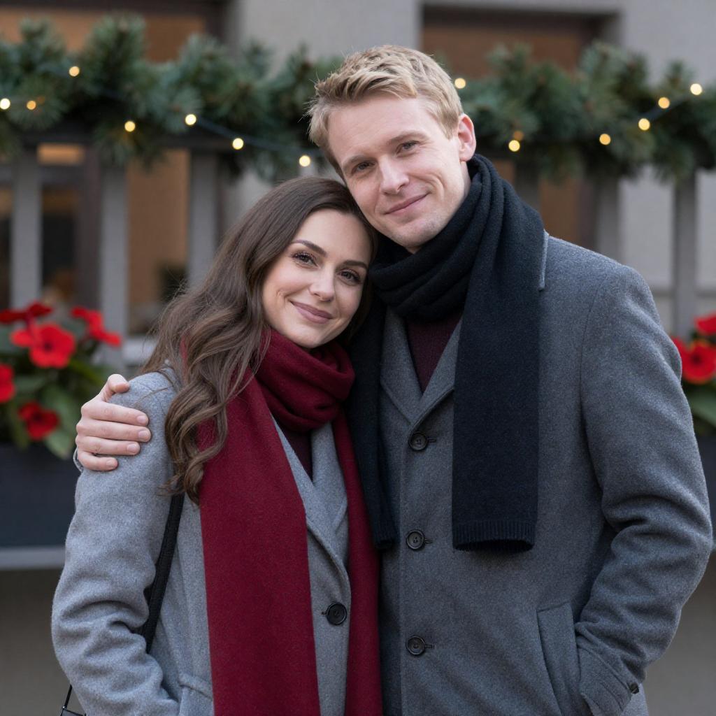 Photograph of a man and woman standing outdoors at a festive Christmas display. Woman with red hair in dark blue coat and red heels, looking down. Man with short blonde hair in dark blazer and tan pants, looking at her. Background has decorated Christmas trees, red and white ornaments, and a snowman. Snow on the ground. Woman's hands by her sides, man's hands in pockets. Dim evening light.