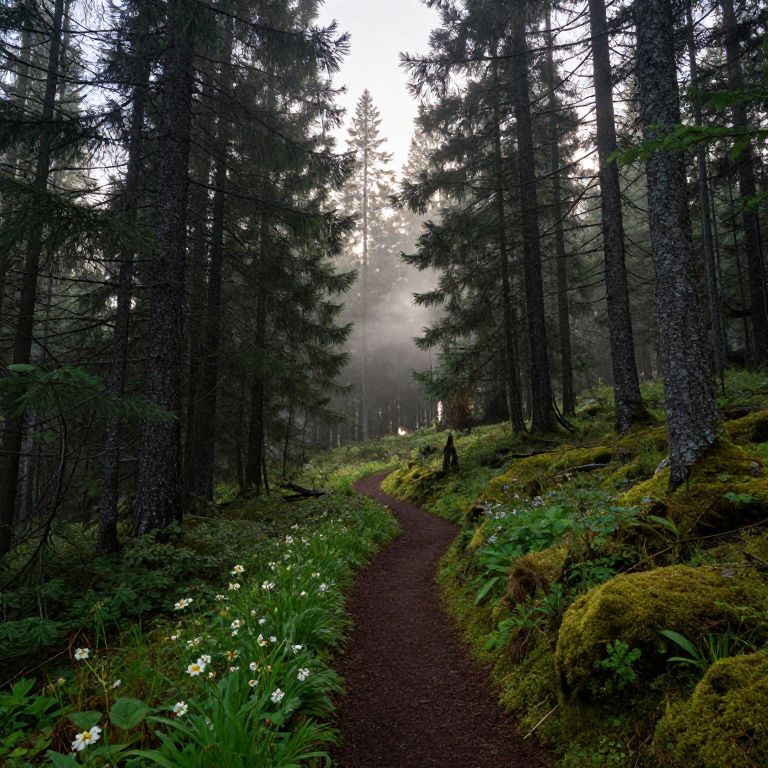 Photograph of a misty forest path: A narrow, winding dirt trail cuts through a dense forest of tall, dark evergreen trees. The forest floor is lush with green moss, ferns, and white wildflowers. Light filters through the misty canopy above, creating a serene, ethereal atmosphere. The path leads deeper into the forest, disappearing into the fog. The scene is rich in natural textures and colors, with deep greens, browns, and the soft white of the flowers contrasting against the dark tree trunks.
