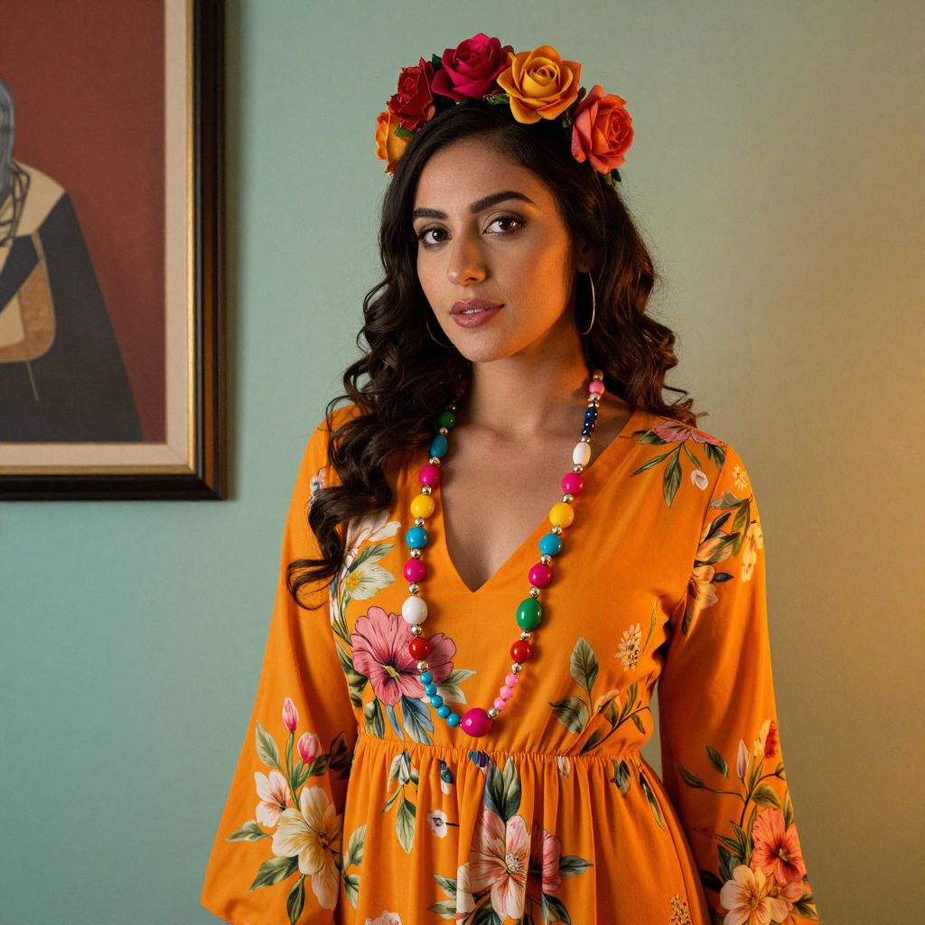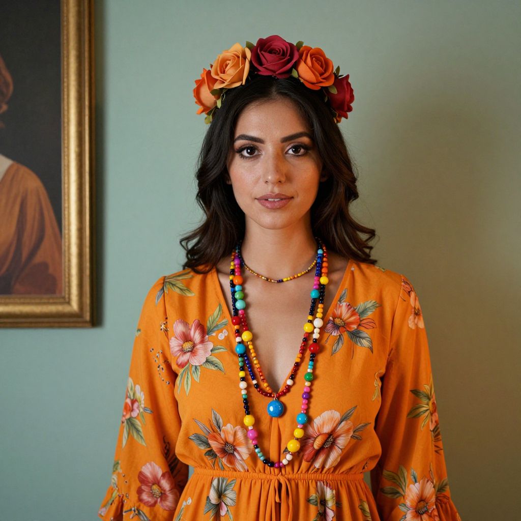 Woman wearing a vibrant orange floral dress adorned with a colorful beaded necklace and a rose crown, standing against a soft teal wall with warm ambient lighting and a framed artwork to her left.
