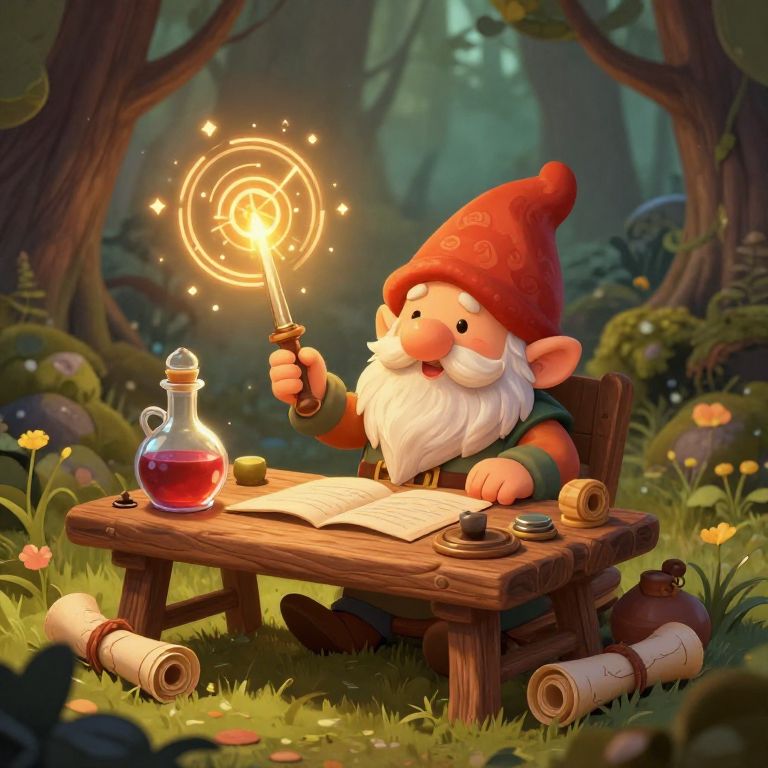 A whimsical gnome in a red hat writes at a wooden table, holding a glowing magic wand in a enchanted forest. Digital illustration.