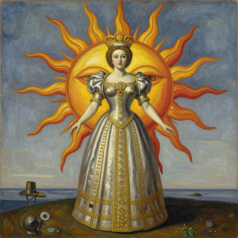 Surrealist painting of a regal woman in a silver gown with gold trim, crowned, standing before a radiant sun halo, surrounded by a dark