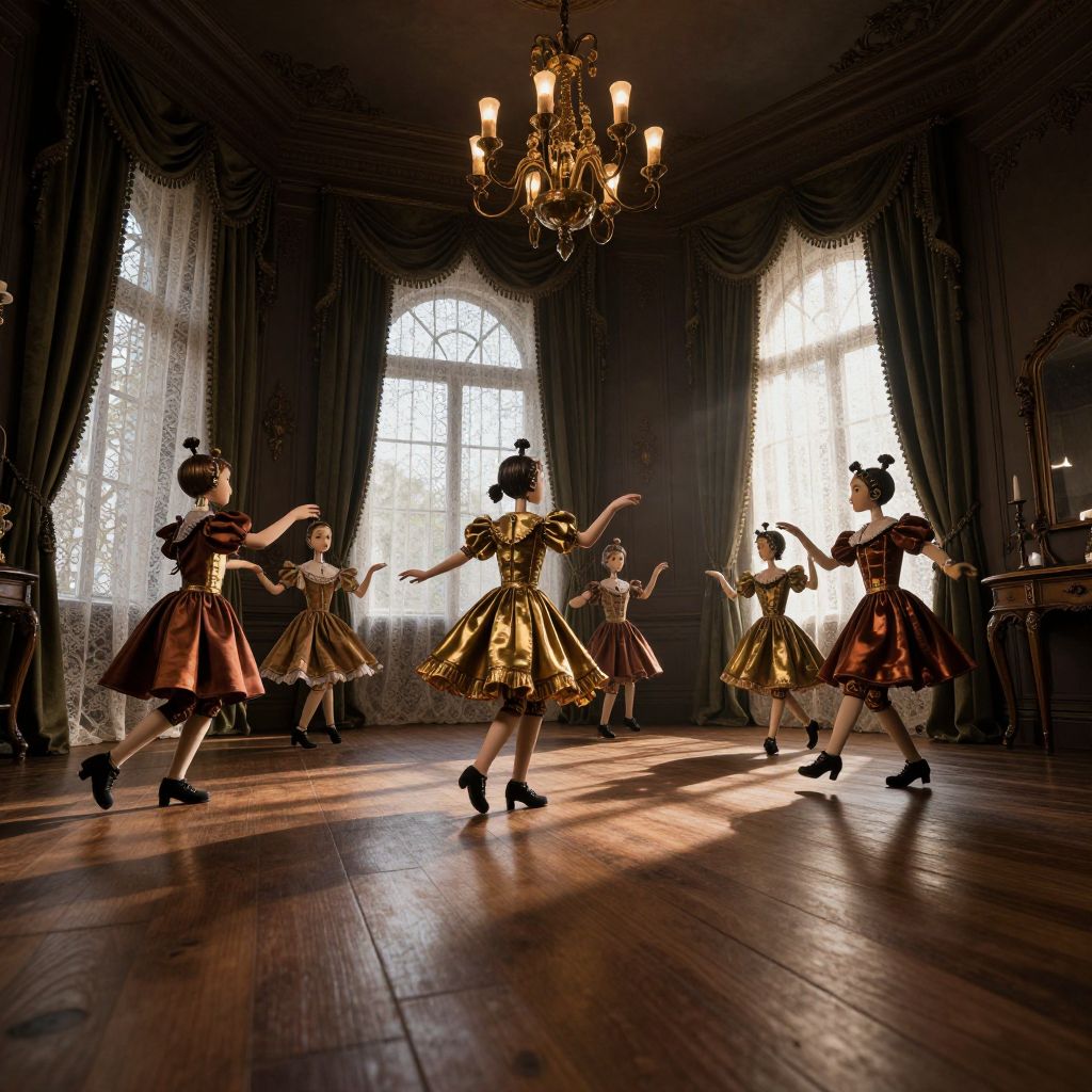 Dive into an enigmatic Victorian parlor where whimsical automaton children perform intricate dances with fluid precision. These mechanical dolls, crafted from mahogany and brass, move with grace despite their lack of emotion, creating a captivating yet unsettling atmosphere. Lit by a single chandelier, the room casts long shadows that stretch across polished wooden floors, enhancing the mysterious ambiance. From a low angle, peer through floor-length windows into this peculiar world as sunlight filters through lace curtains, blending innocence and darkness in a dreamlike setting where the line between the two becomes blurred.