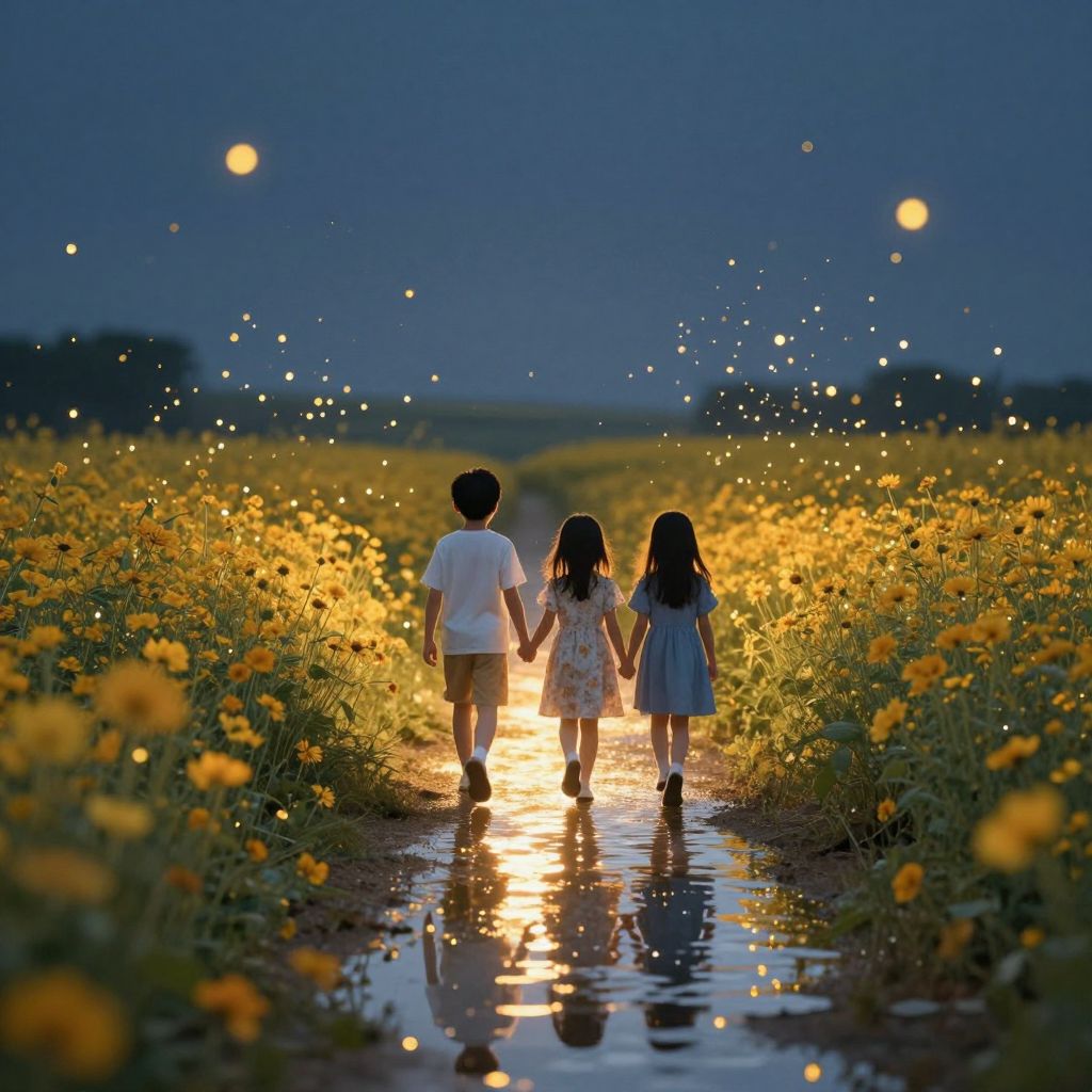 Photograph of a twilight scene featuring two children, a boy in a white t-shirt and shorts, and a girl in a light blue dress, holding hands and walking down a path of glowing yellow flowers. The path reflects their footsteps in a shallow puddle. Fireflies surround them, creating a magical ambiance. The sky is a deep blue, with two visible moons adding a dreamy quality. The background includes dark silhouettes of trees and fields. The image is warm and serene, with a focus on the children's innocence and the enchanting natural setting.