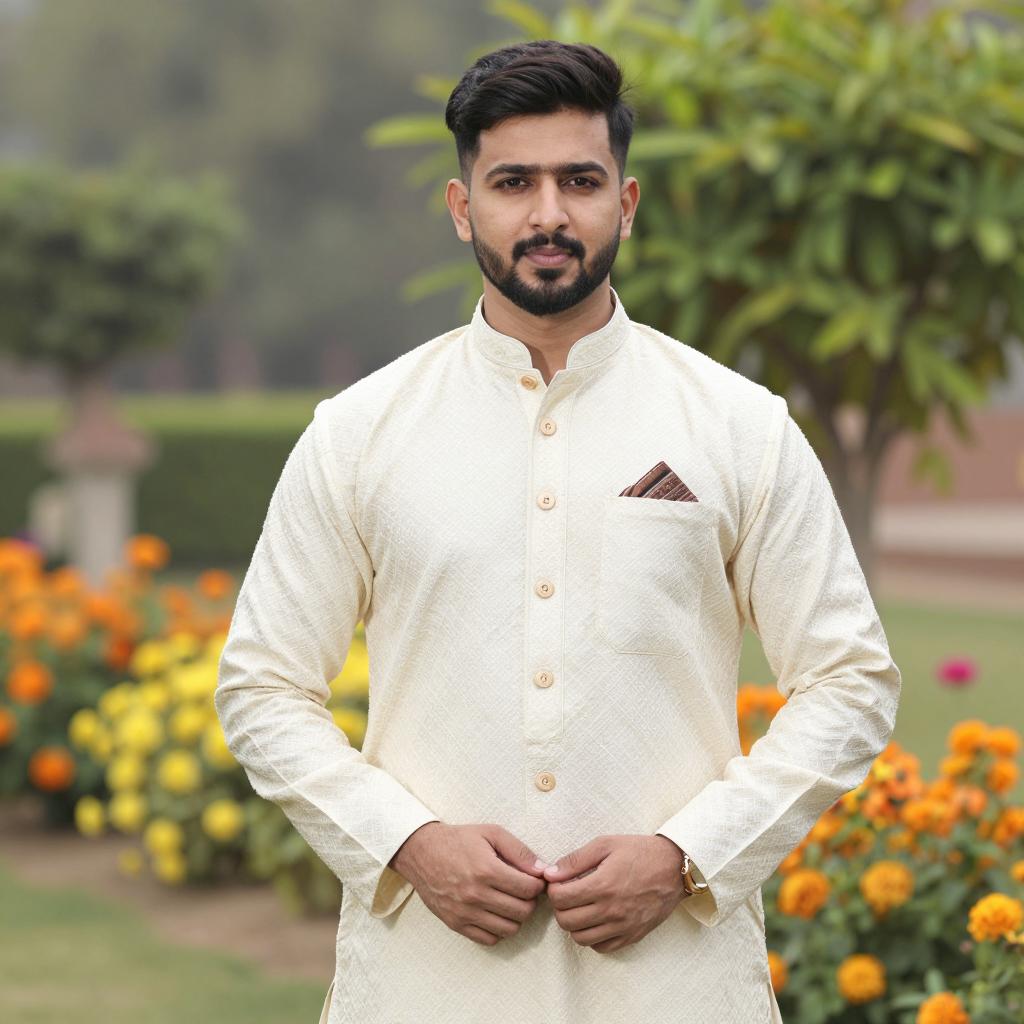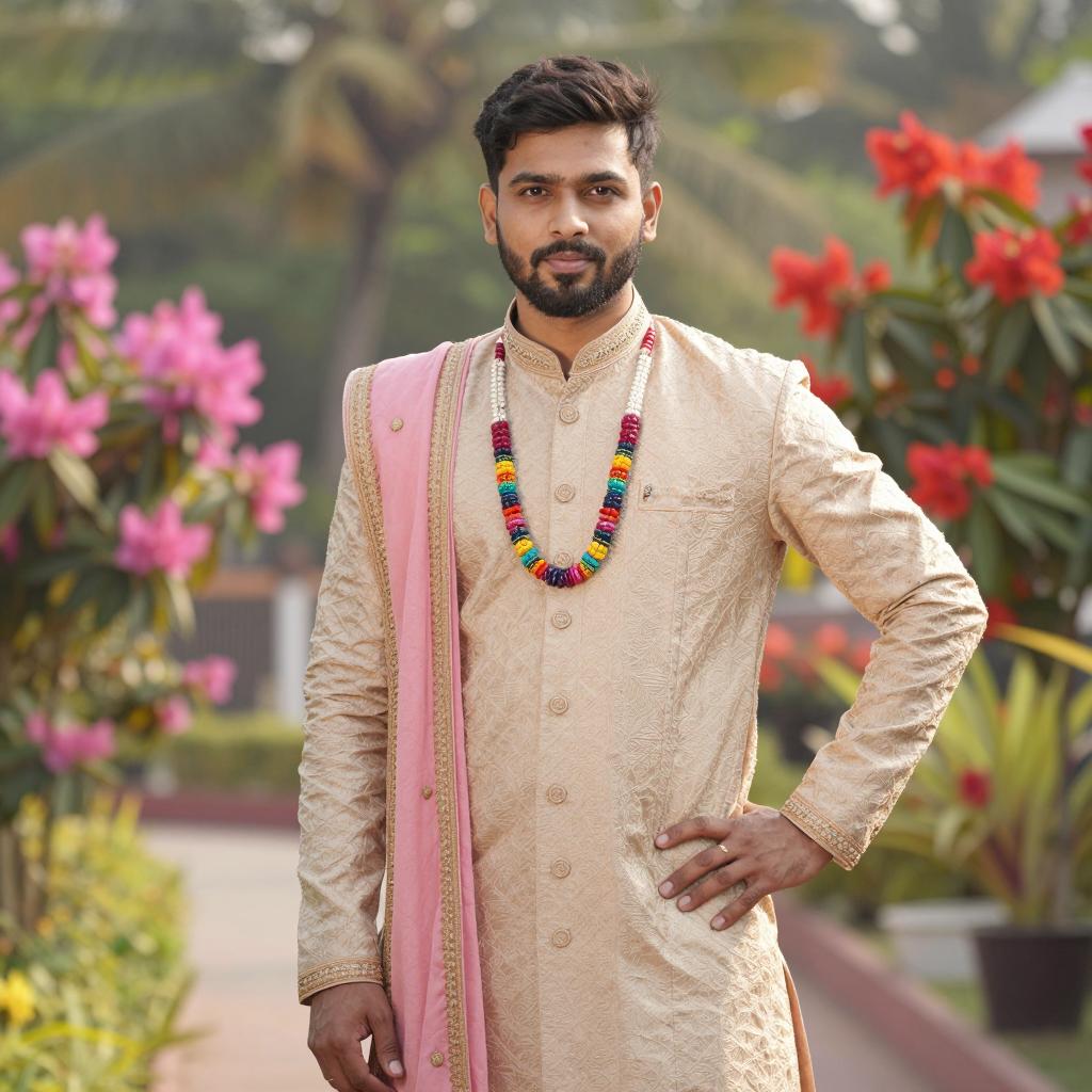 Western style sherwani, photograph of a handsome Indian man, medium build, short black hair, trimmed beard, wearing a maroon traditional Pakistani kurta with gold embroidery, standing in a colorful garden with vibrant flowers, sunlight, blurred greenery background, daytime, confident expression, hand by side, natural light, realistic, detailed ures