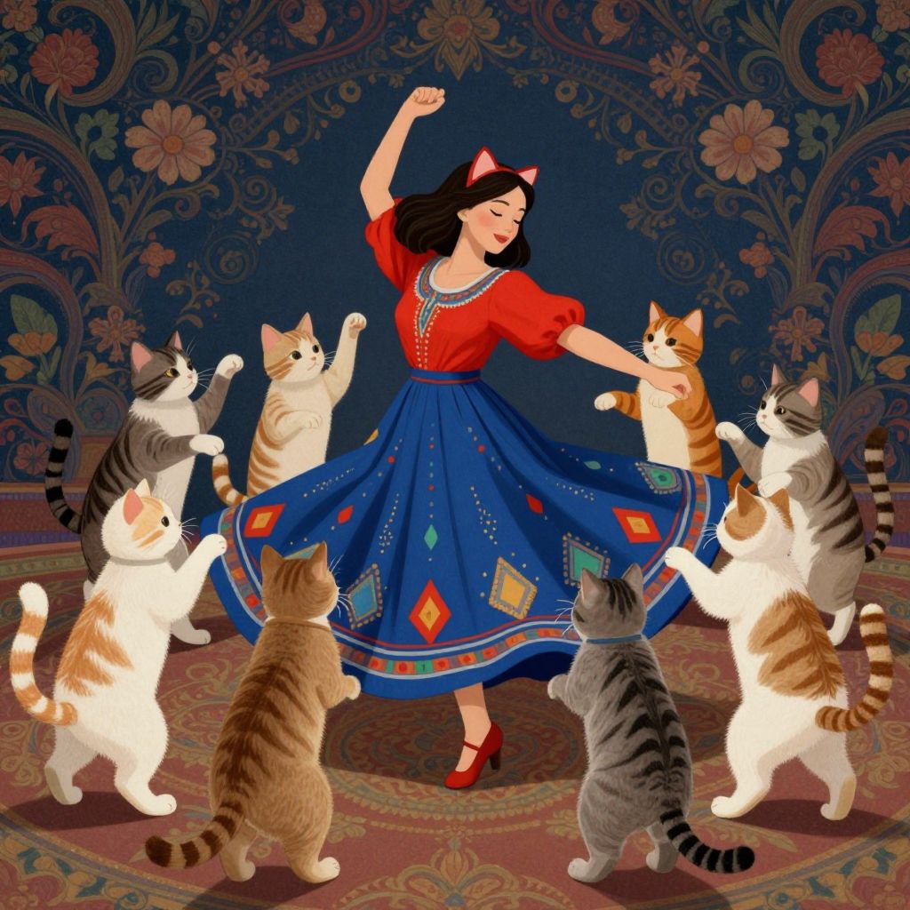 Digital illustration of a woman in a red dress and blue skirt, dancing with six cats on a patterned rug, against a floral backdrop. Cats have
