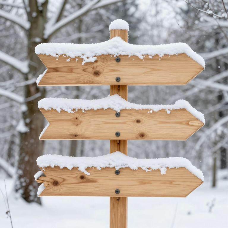 Snow-covered wooden directional arrows, crafted from light-colored wood and secured with dark metal bolts, stand prominently against a backdrop of winter trees, guiding through a serene snowy landscape.