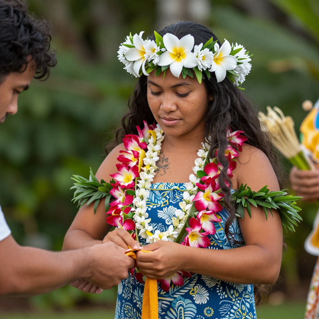 Photograph of a young Pacific Islander woman with dark brown skin and long black hair, adorned with a white and yellow flower crown. She wears a blue dress with white floral patterns and a red and white flower lei around her neck, which she is holding with both hands. A man with curly black hair and medium brown skin, wearing a white shirt, is adjusting the lei on her right side. The background is blurred, showing green foliage. Another person with a similar flower crown is partially visible on the right.