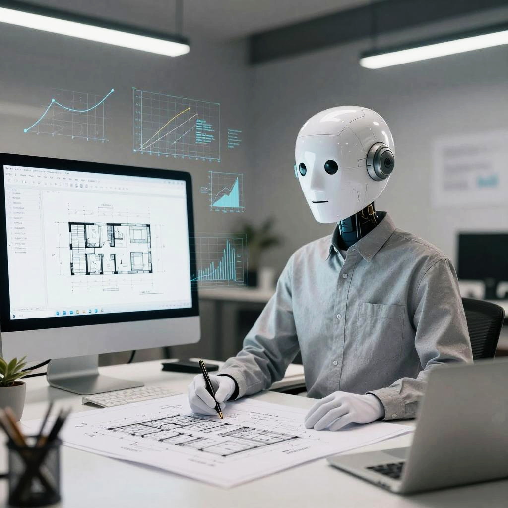 Visual concept of AI to DWG conversion featuring an AI avatar guiding the transformation of hand-drawn architectural sketches into crisp DWG files, digital graphs and blueprint details floating around, high-tech workspace ambiance.
