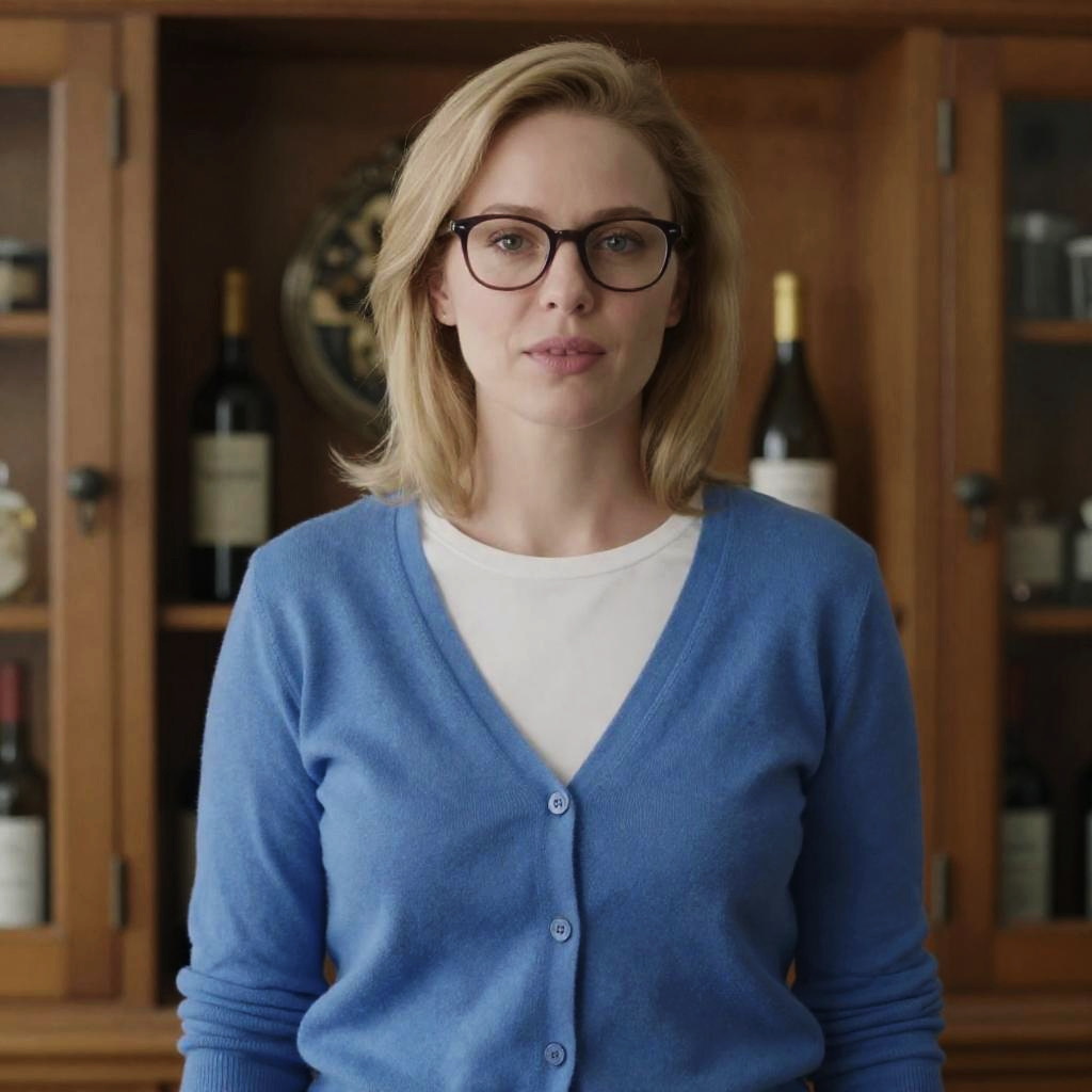 Photograph of a blonde woman with glasses, wearing a blue cardigan over a white shirt, standing in front of a wooden cabinet. Background includes various bottles and a decorative metal piece. She has a neutral expression, slightly parted lips. Multiple bottles with different labels are visible on the cabinet.