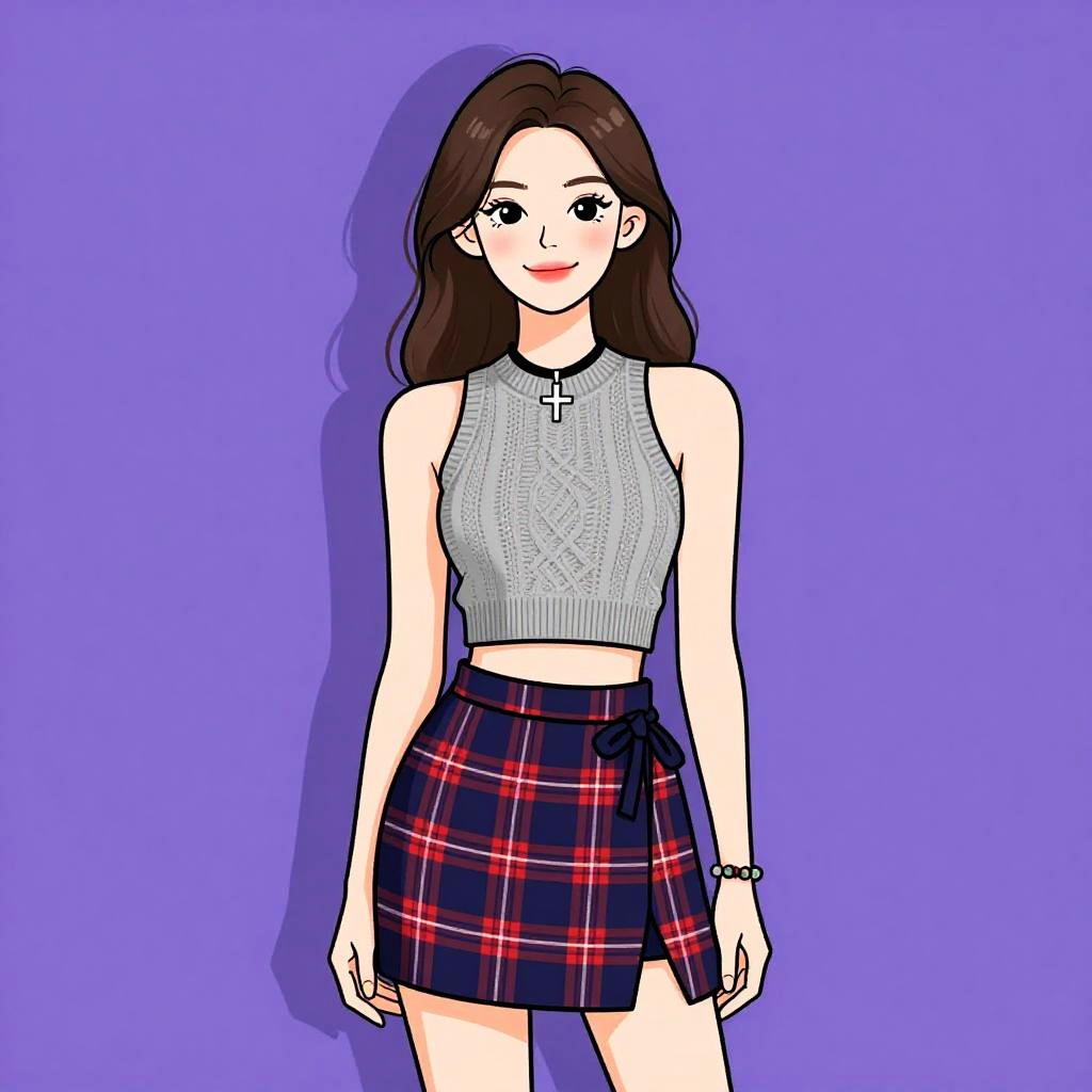 This digital illustration features a young woman with fair skin and long, dark brown hair standing against a solid purple background. She wears a sleeveless, light gray, knitted crop top with a cross necklace and a red and black plaid mini skirt. Her left wrist has a bracelet, and she has a slight, confident smile. The style is anime-inspired, with bold lines and vibrant colors. The woman's figure is slim, and she stands with a relaxed posture, facing forward.