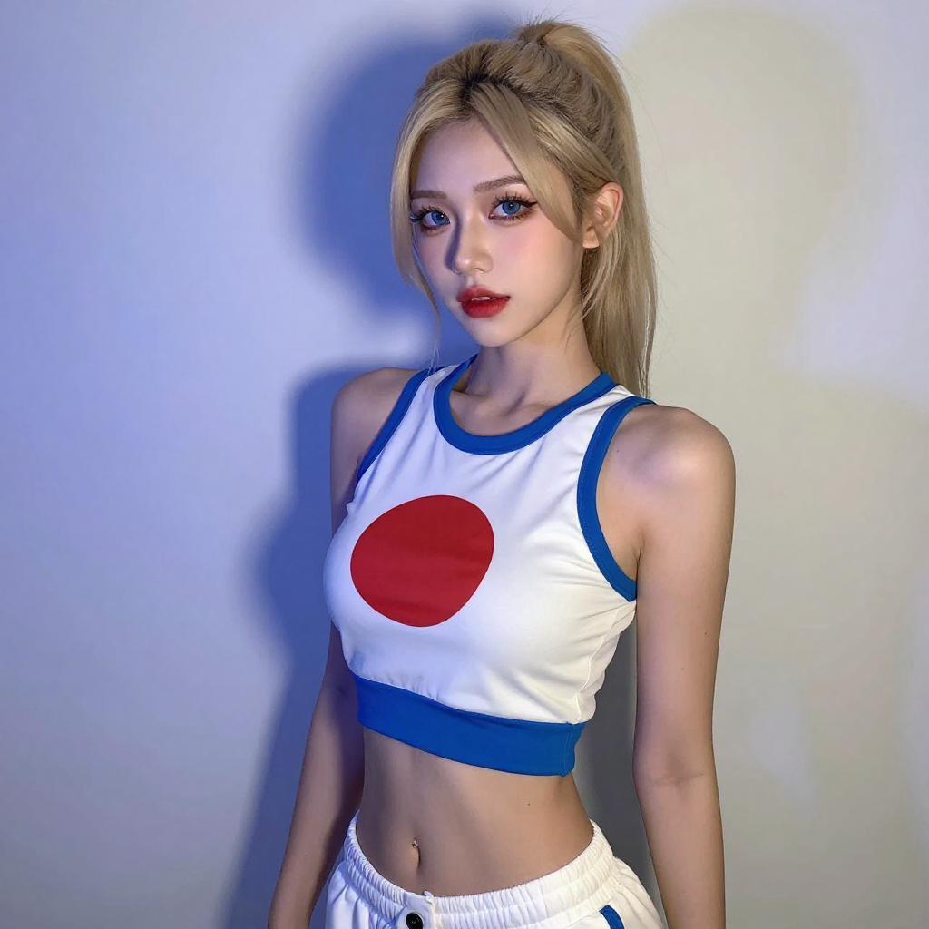 Photograph of a young woman with light blonde hair in a side ponytail, wearing a white and blue "Looney Tunes" tank top. She has fair skin, red lipstick, and black eyeliner, with one arm raised, partially covering her face. The background is a plain white wall with a blue light on the right.