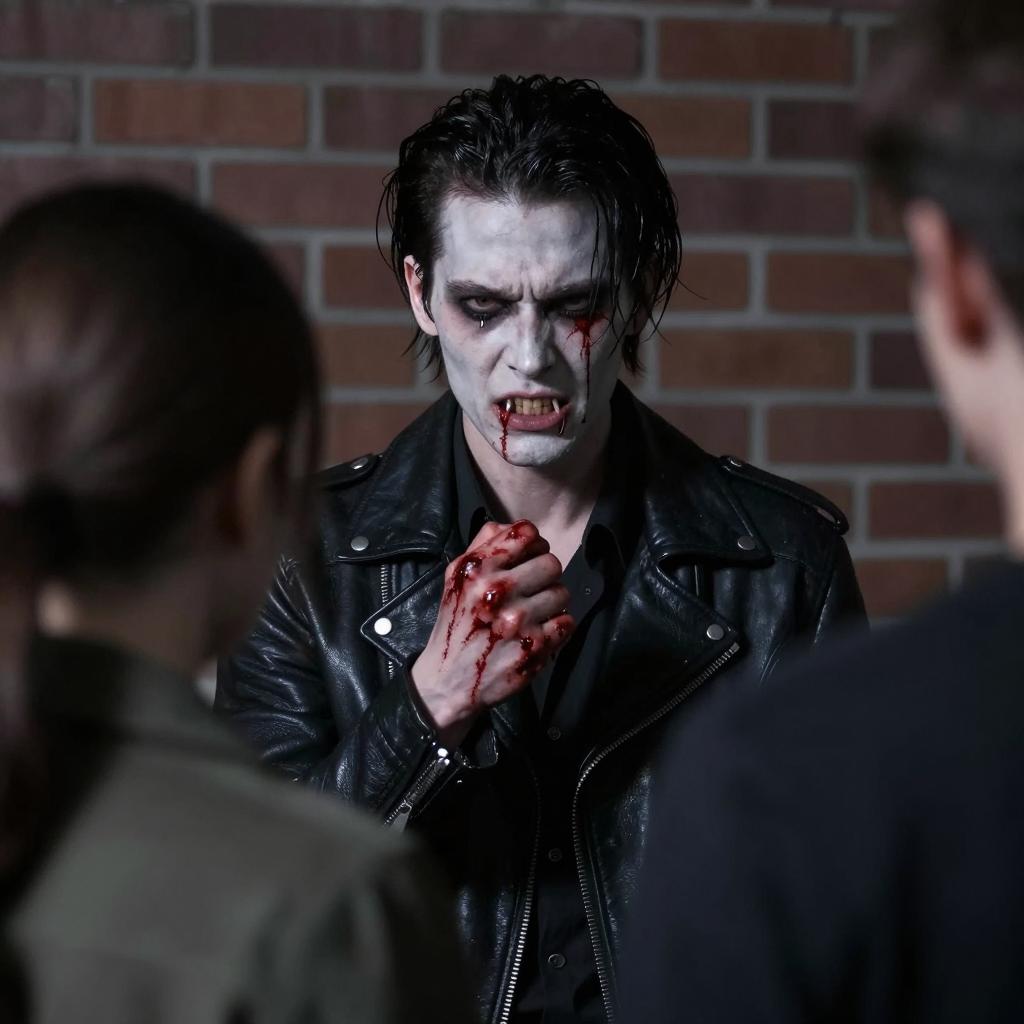 Male with pale skin, dark slicked-back hair, black leather jacket, intense expression, and sharp teeth, holding bloodied hand, standing in front of a brick wall. Person with dark hair in foreground, back to camera. Dim lighting. Two people.