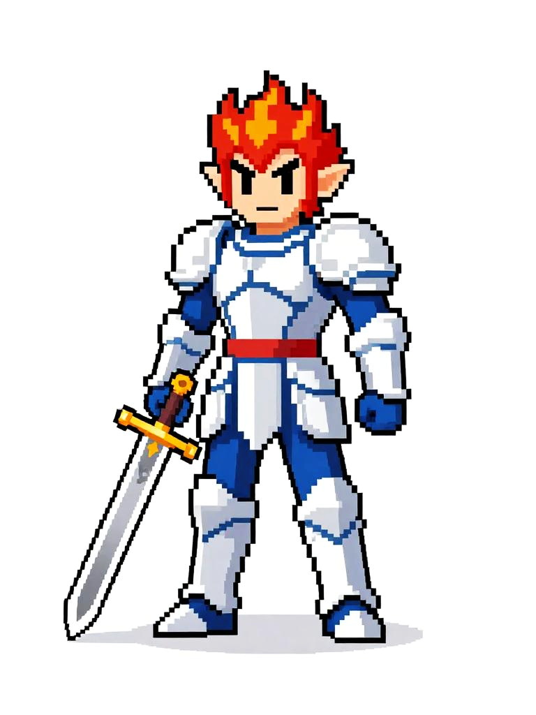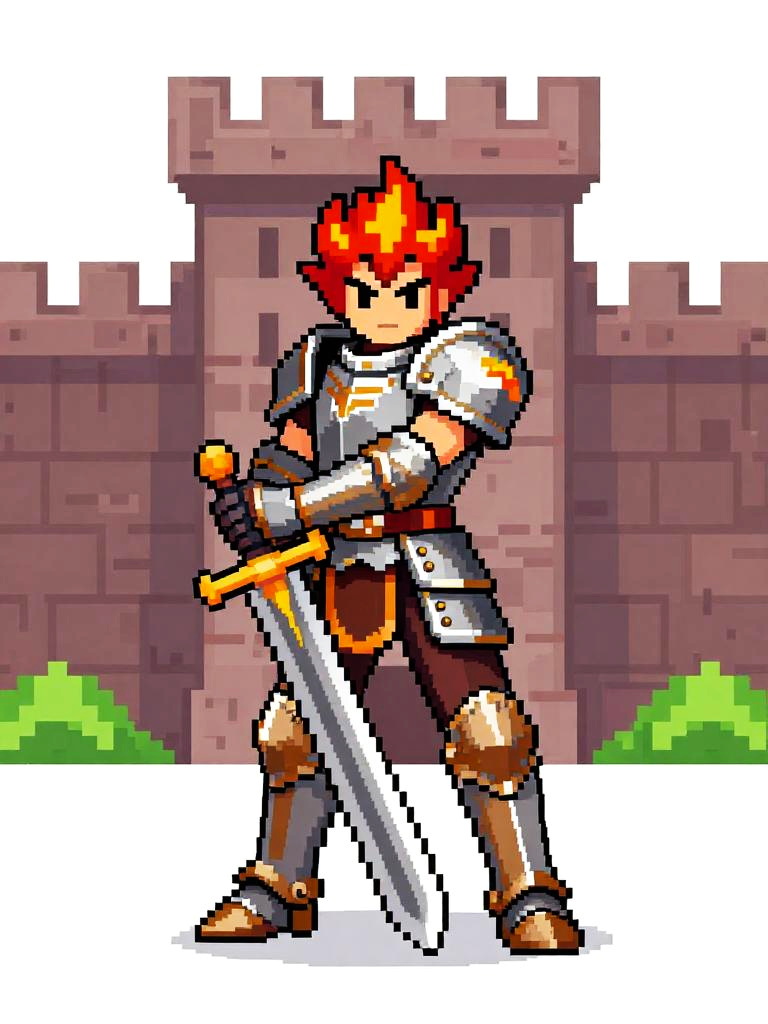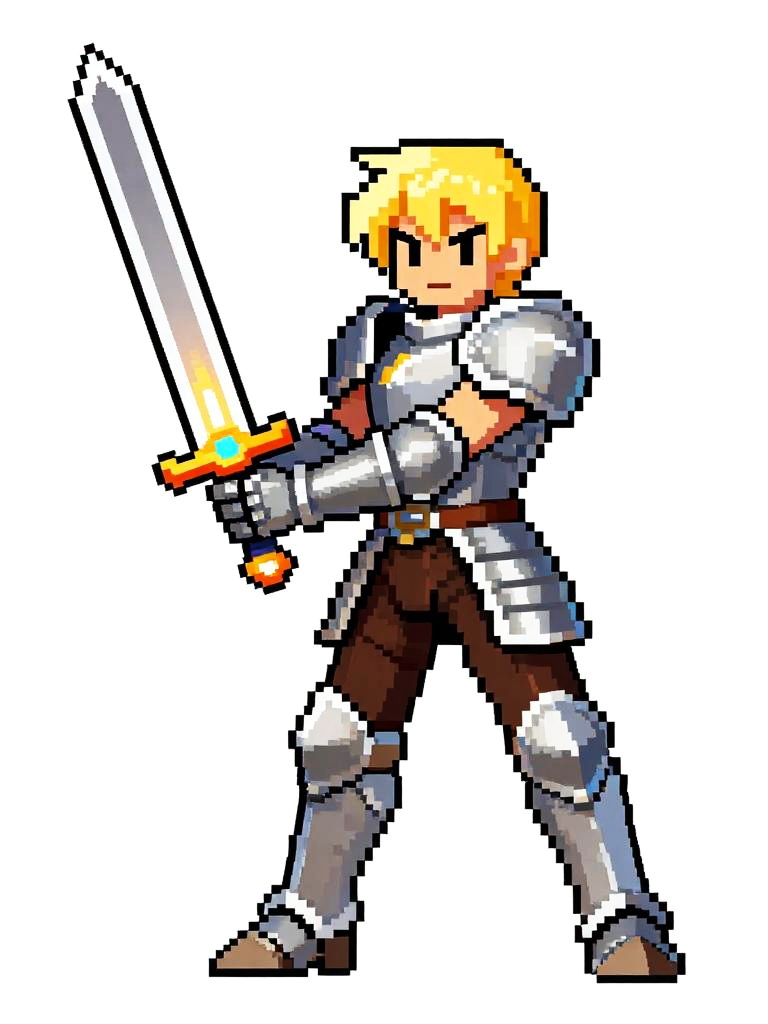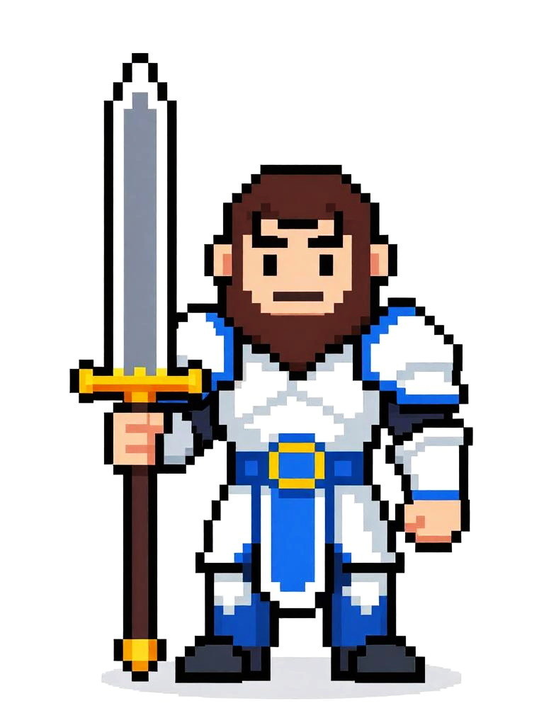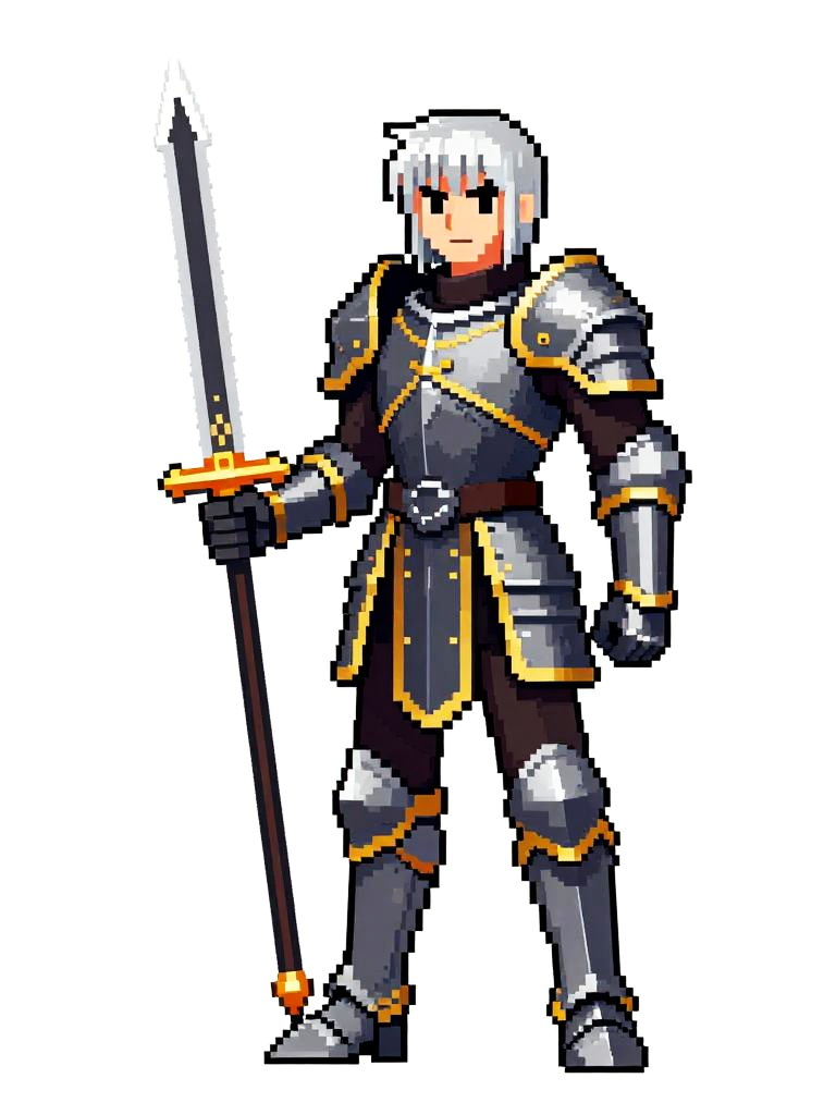 Pixel art of a serious-looking knight with brown hair, wearing gray and gold armor, holding a white sword, standing on grassy terrain.