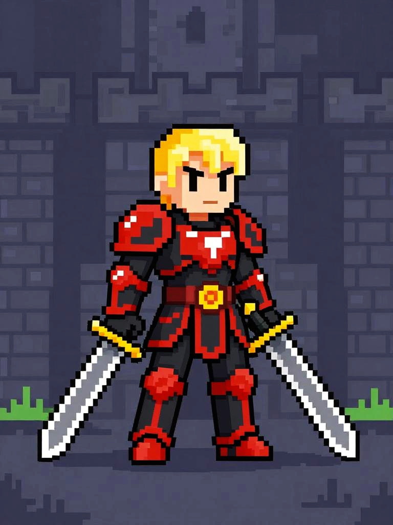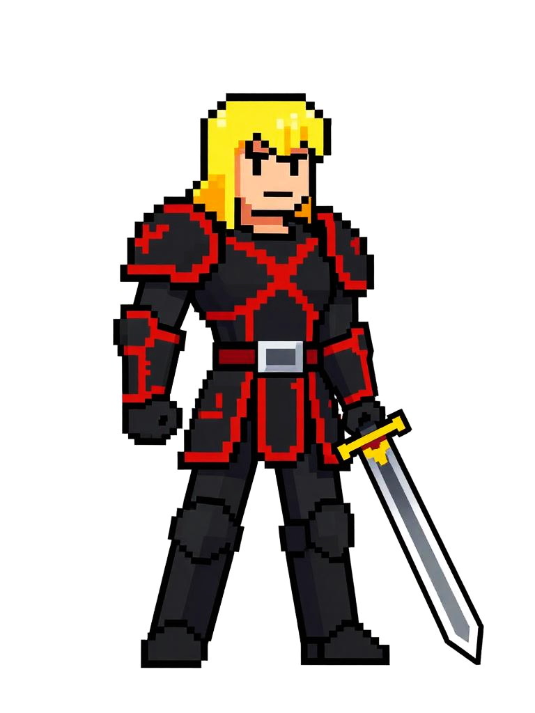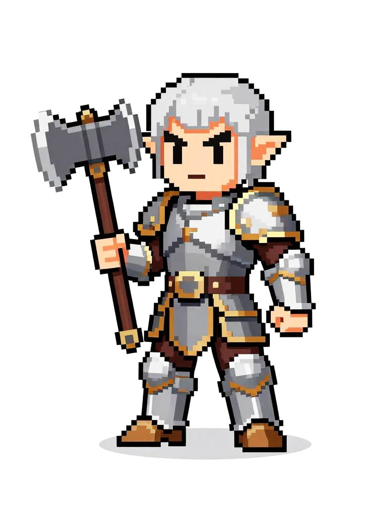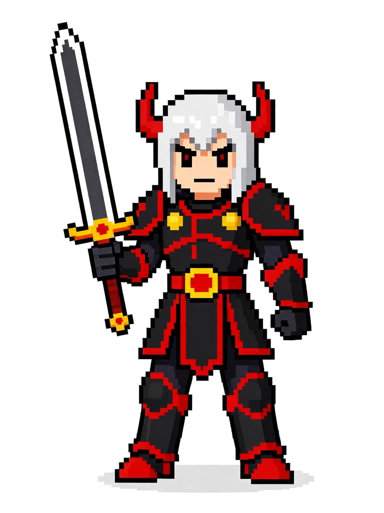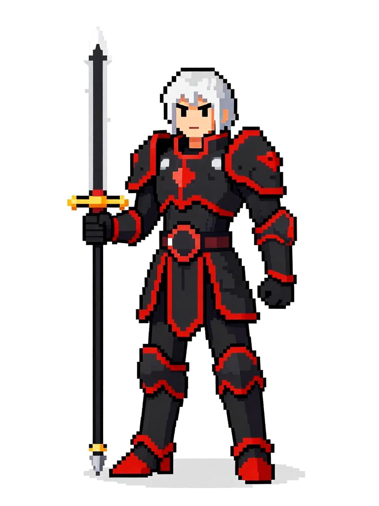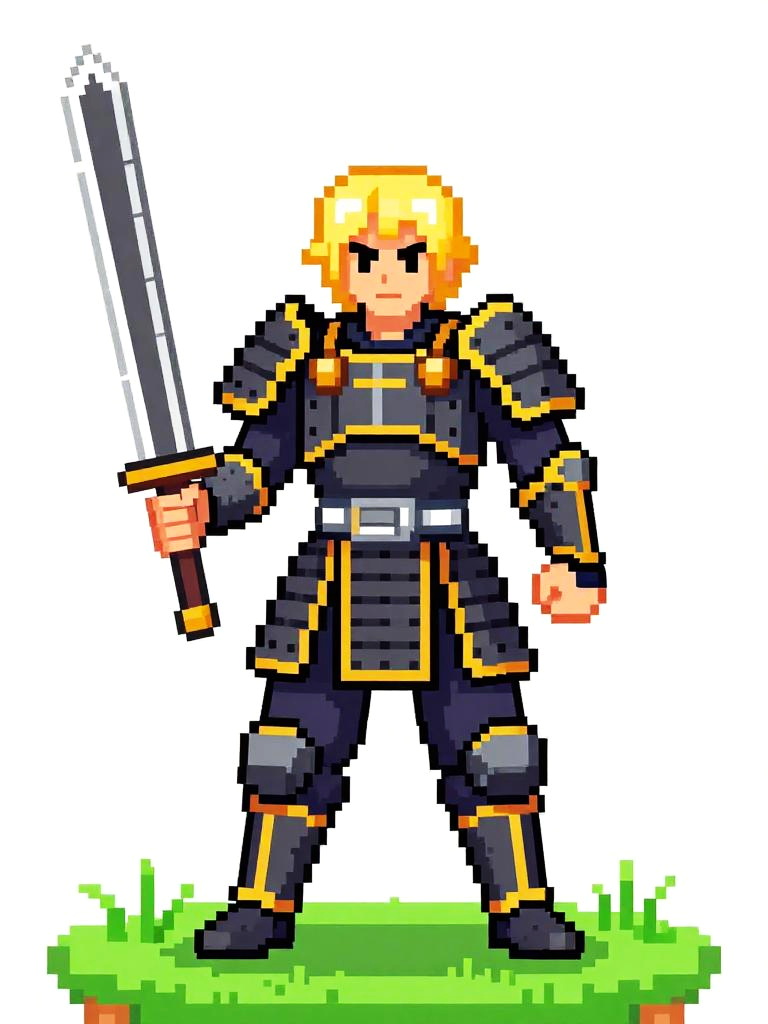 Pixel art of a serious-looking knight with brown hair, wearing gray and gold armor, holding a white sword, standing on grassy terrain.