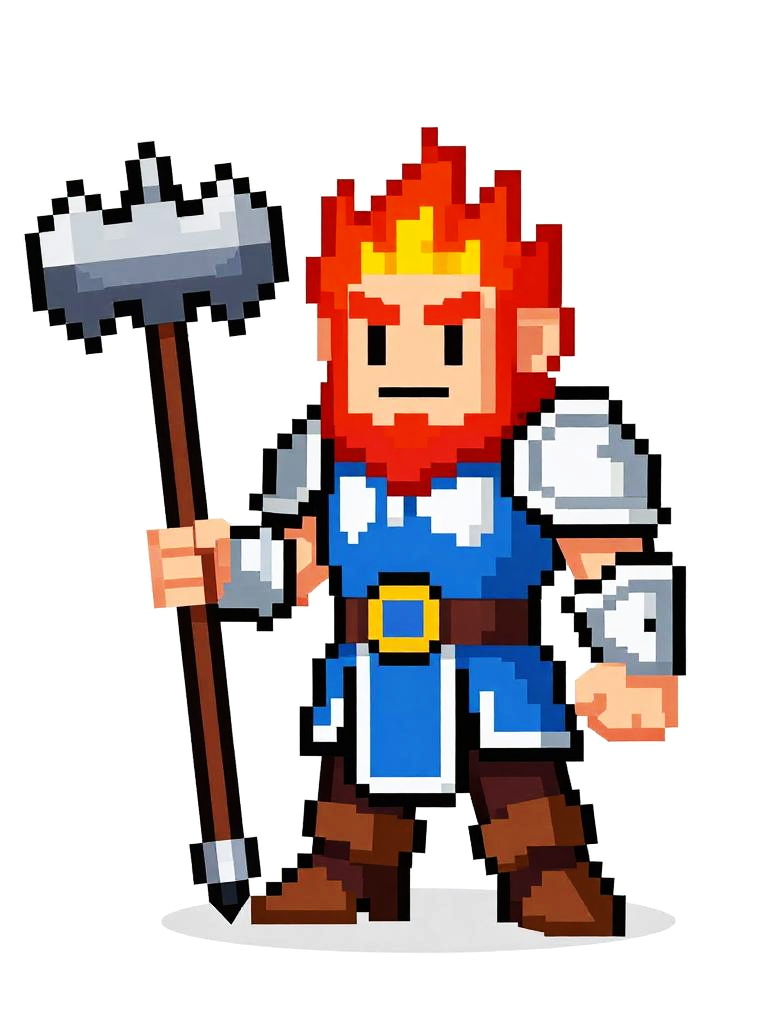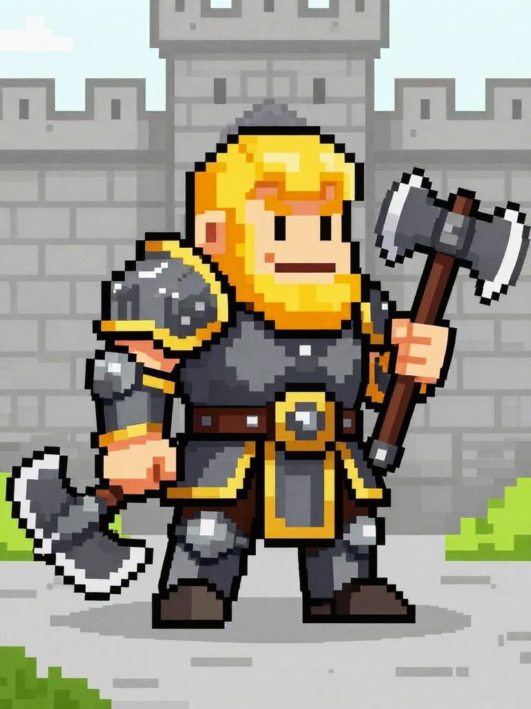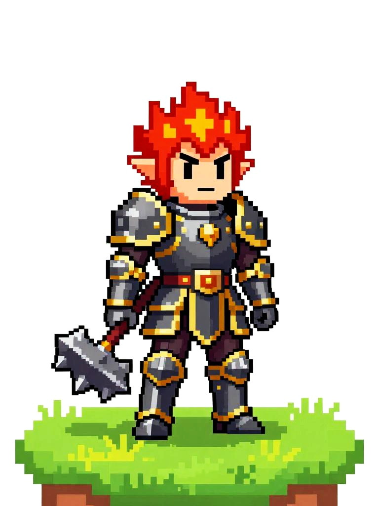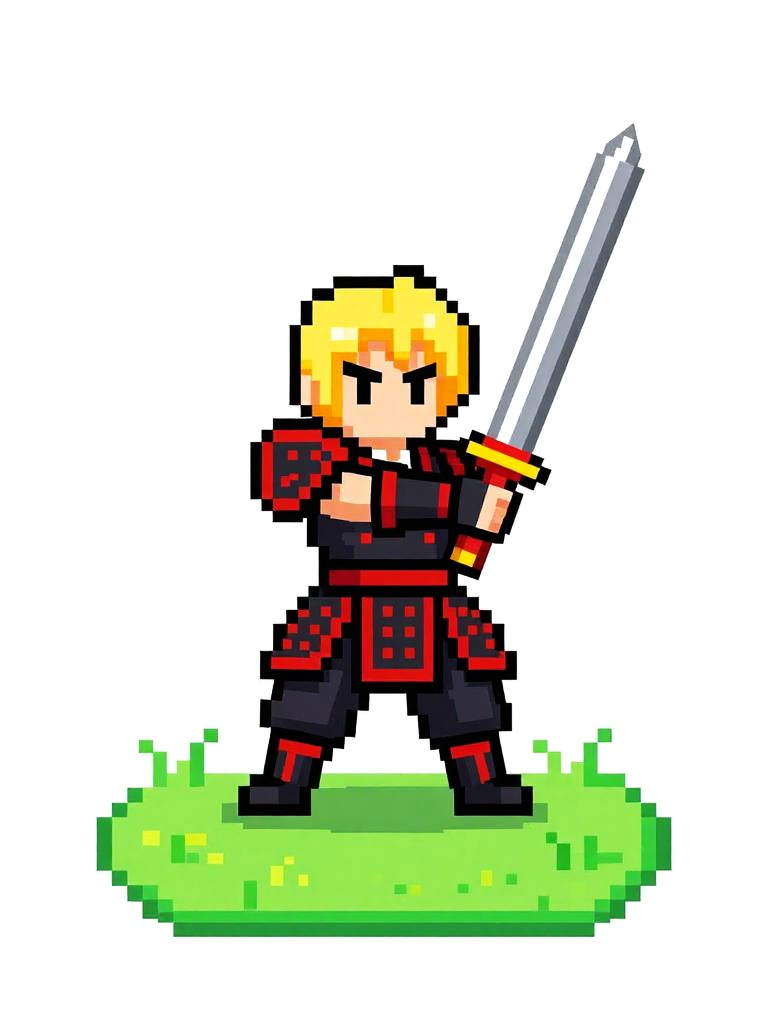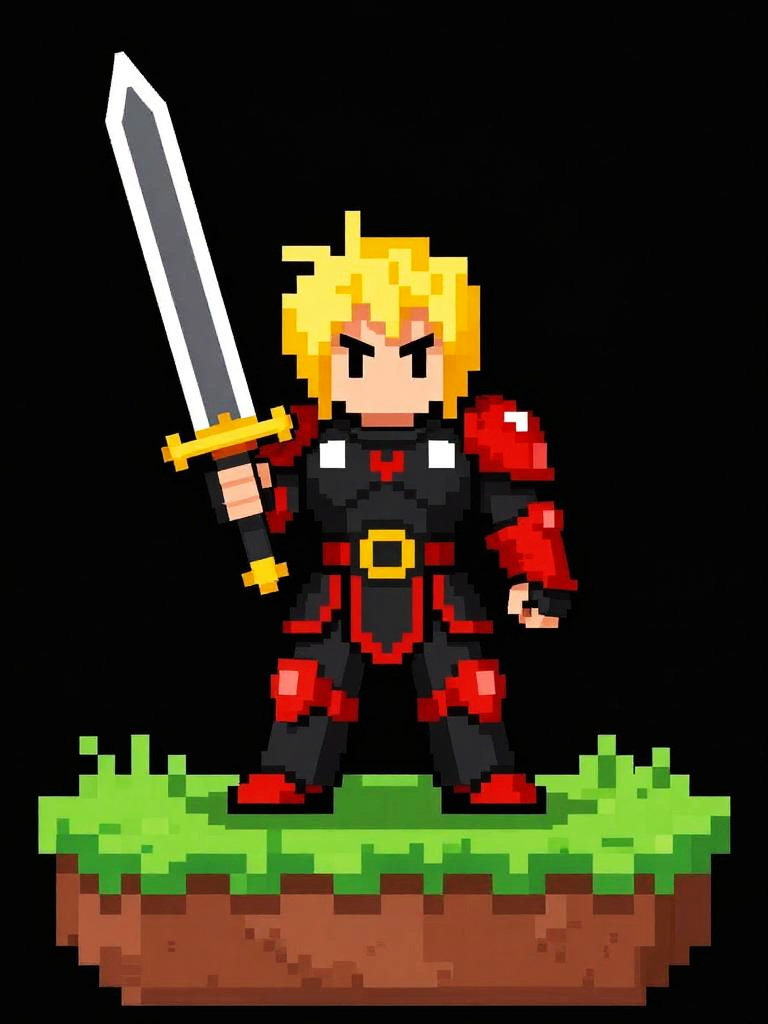 Pixel art of a serious-looking knight with brown hair, wearing gray and gold armor, holding a white sword, standing on grassy terrain.