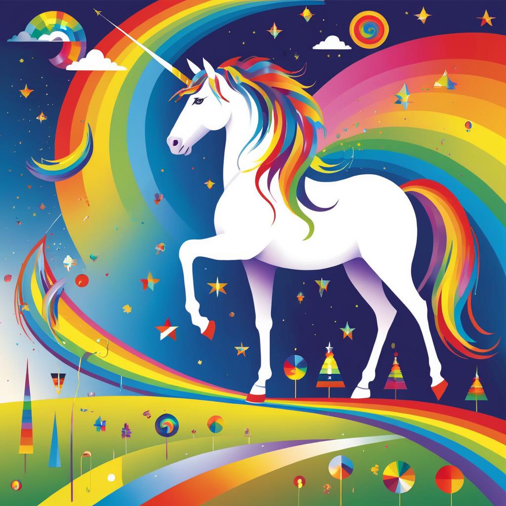 Unicorn by Wassily Kandinsky holding a rainbow, creative and surreal composition.